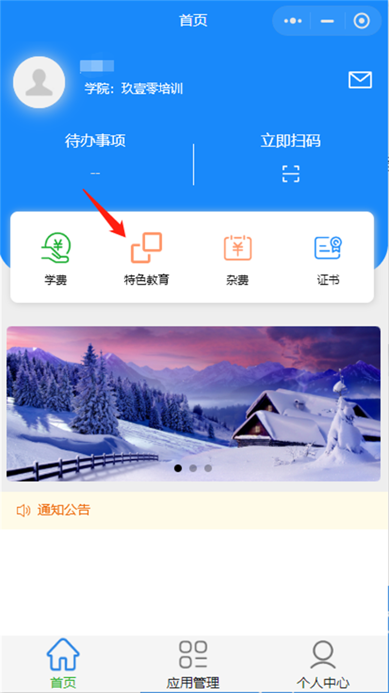 进入小程序后根据通知,可通过【特色教育】指引进行费用缴纳。