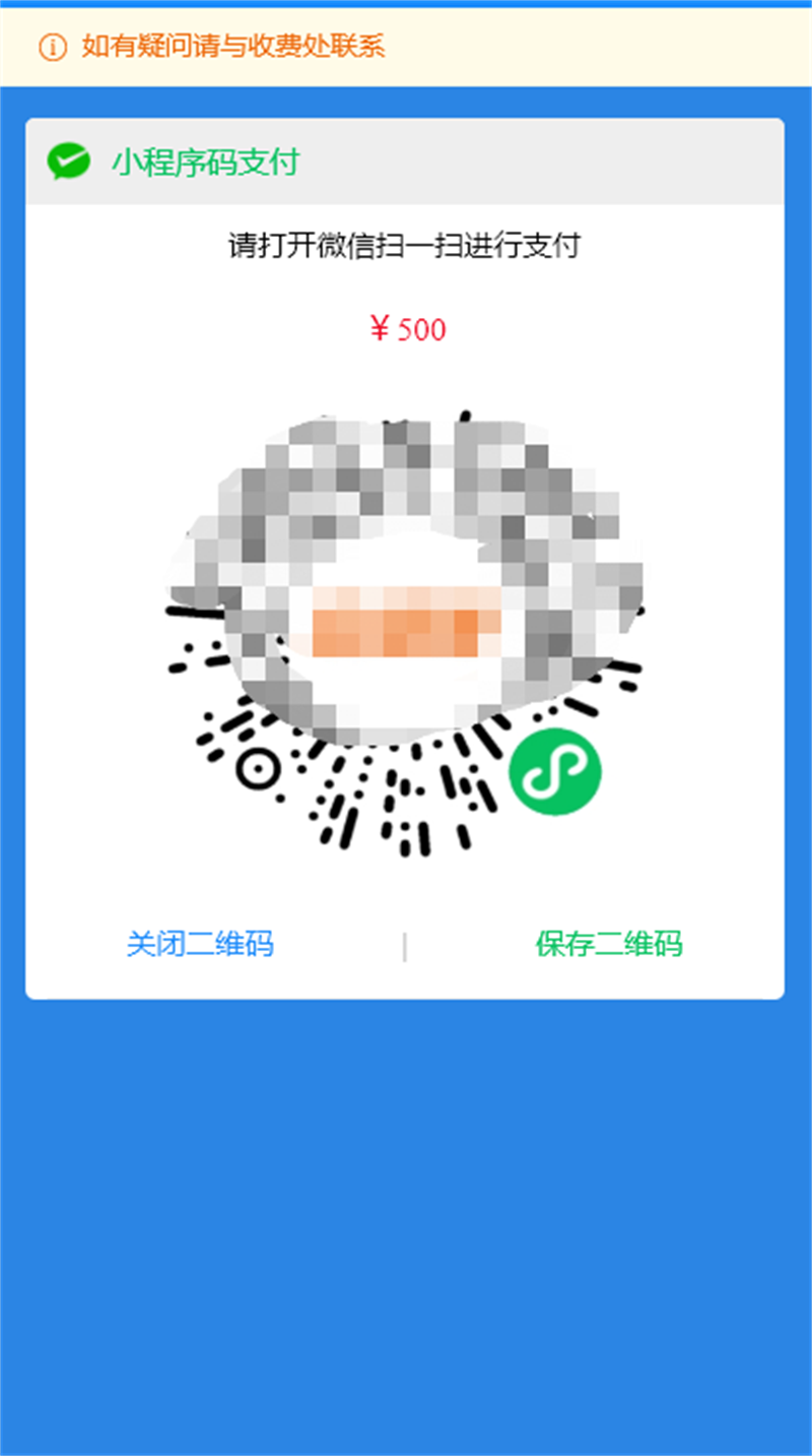 (2)支付方式二:点击【二维码缴费】,系统会自动生成一个付款二维码,其他人微信扫描二维码即可缴费。