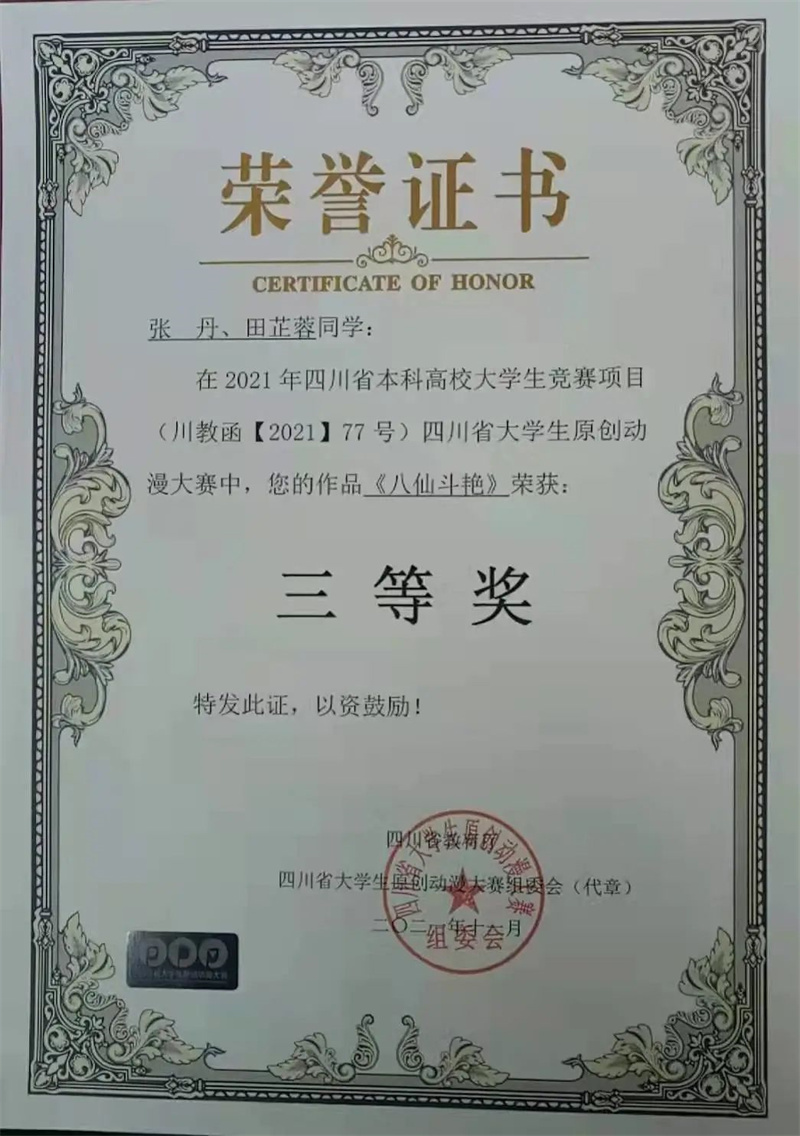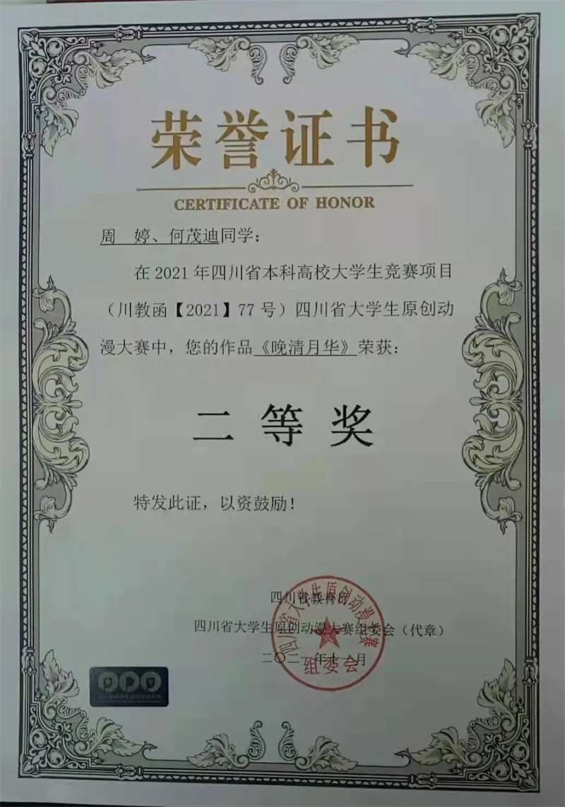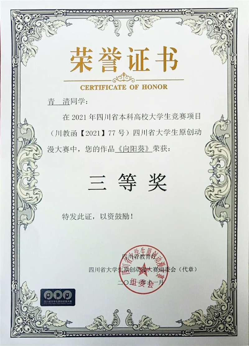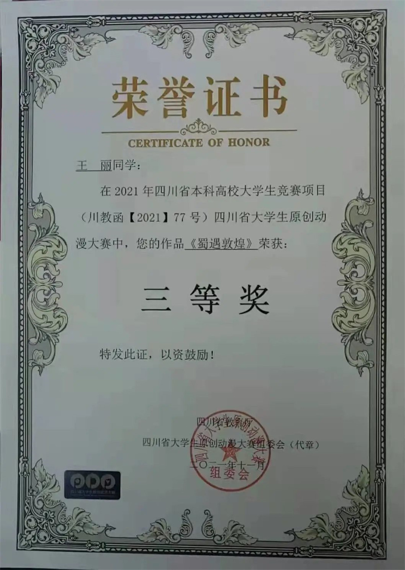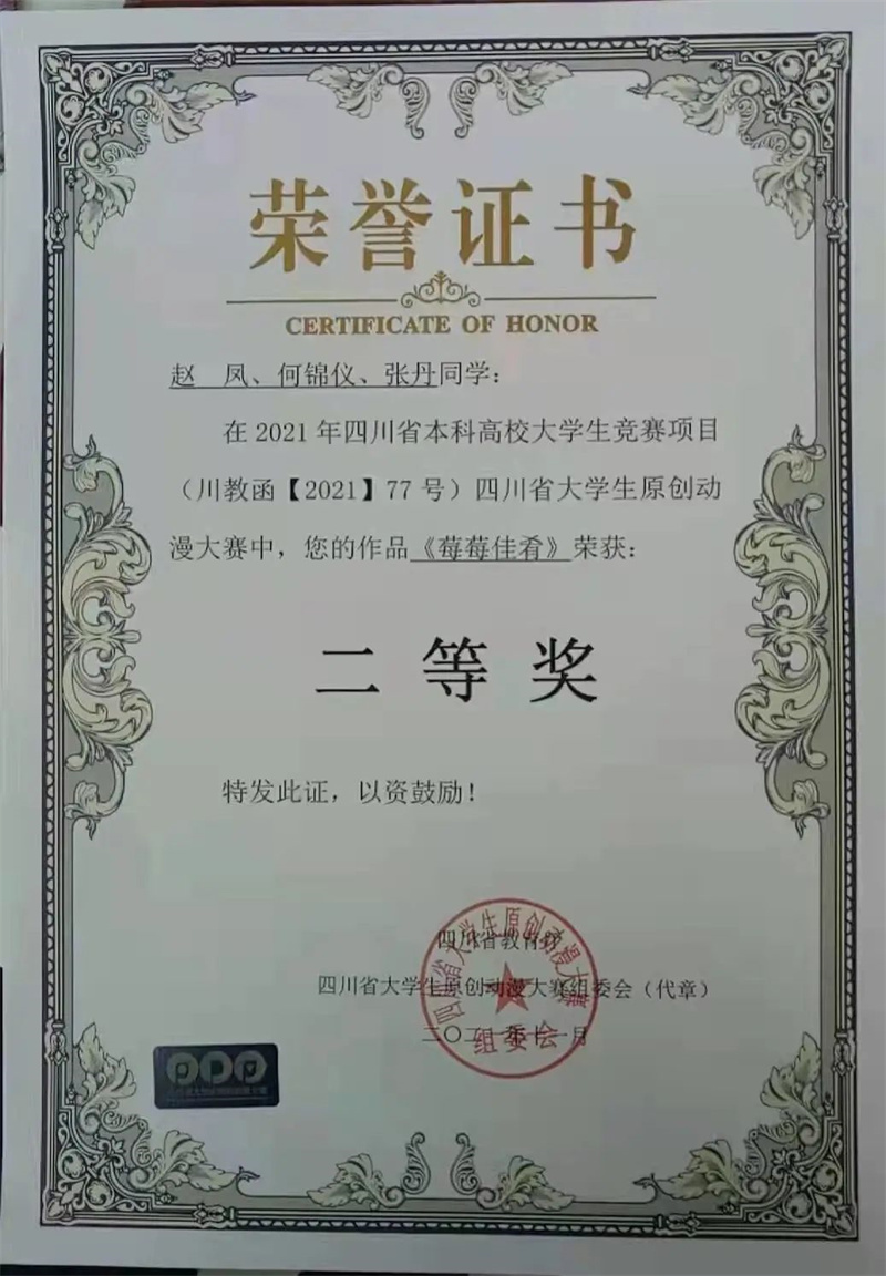 佳音频传,喜事连连。近日,“2021年四川省大学生原创动漫大赛”在四川传媒学院落下帷幕。我校传媒艺术学院数字媒体系动漫设计专业和艺术设计系广告艺术设计专业师生在大赛中共收获一等奖1项,二等奖4项,三等奖5项。王强老师和刘琳毓老师分别荣获“优秀指导教师奖”!