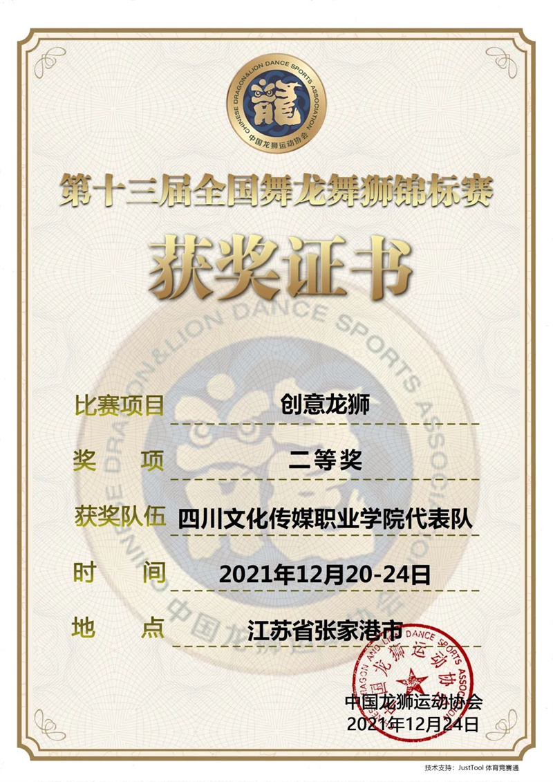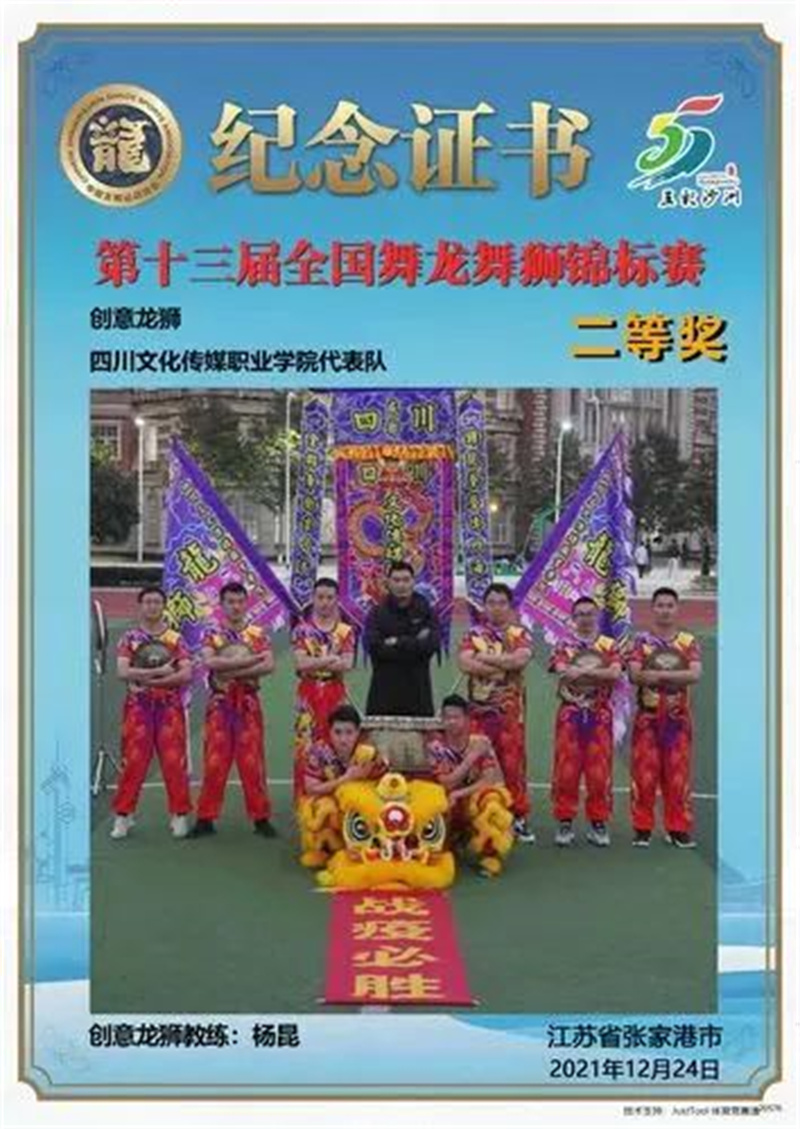 日前,第十三届全国舞龙舞狮锦标赛落下帷幕,我校龙狮代表队在创意龙狮项目团体赛中取得二等奖的好成绩。