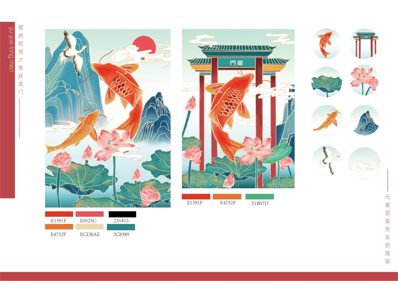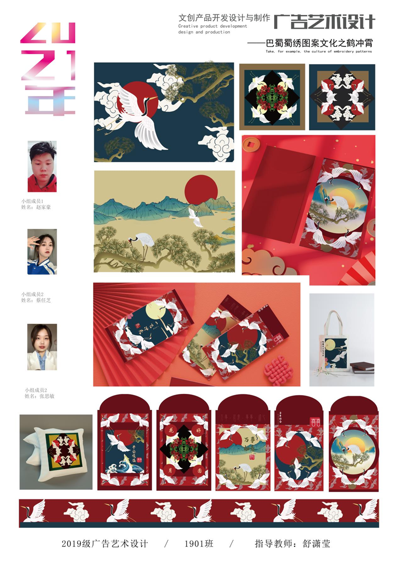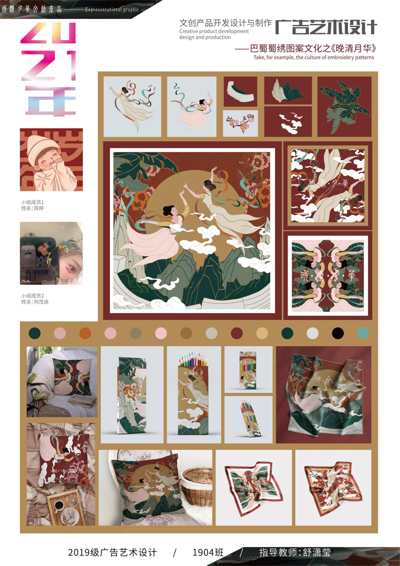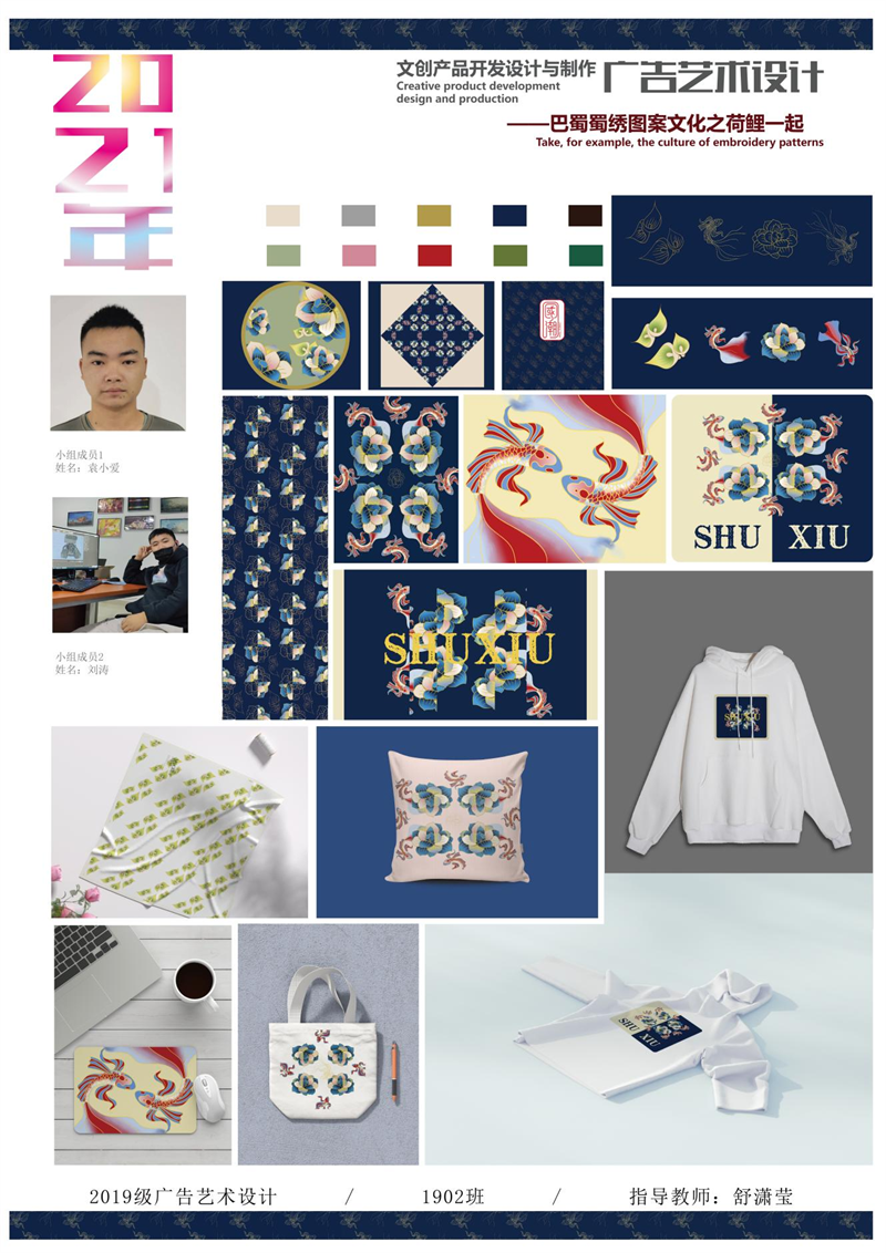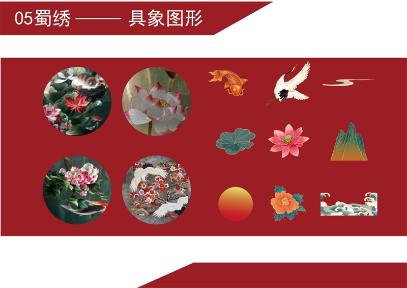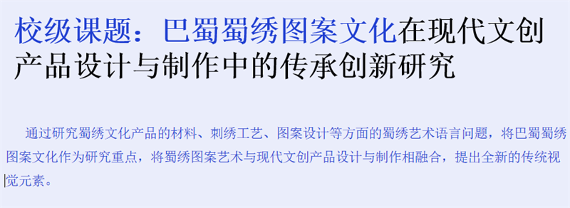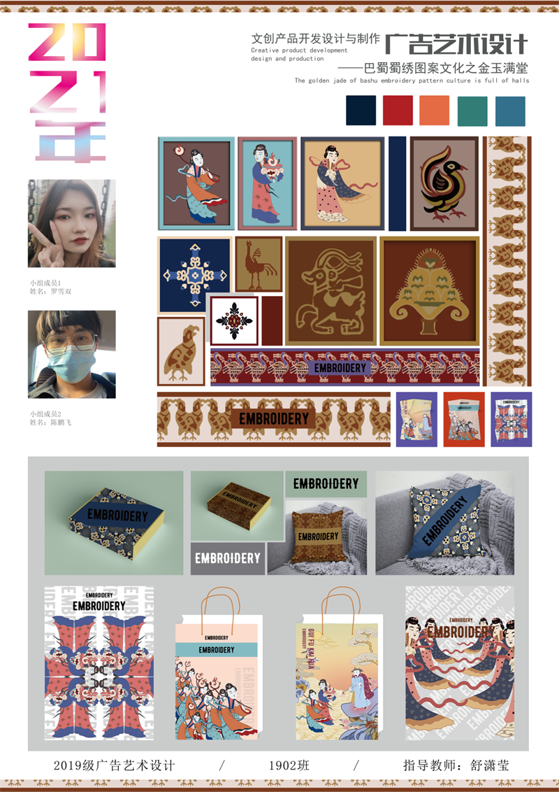 《文创产品开发设计与制作》课程不仅限于传统意义上的平面设计教学,也是某种意义上通过艺术设计的美学制作,广泛宣传对特定文化的推广,促进文化产业的发展,打造地方文化新符号,使现代文创产品设计中具有鲜明的非遗文化内涵及地域,引导学生自觉传承和弘扬中华优秀传统文化,全面提高学生的审美和人文素养,增强文化自信。课程有效的和《巴蜀蜀绣图案文化在现代文创产品设计与制作中的传承创新研究》校级课题结合,以巴蜀蜀绣图案文化为切入点,提供新的视角挖掘巴蜀文化符号,打造特色文化,创新视觉表现。通过过程性教学和项目式任务教学模式,将课程分成几个项目阶段进行教学,学生大胆创新,产出大量文创产品实物,如:鱼跃龙门主题系列红包、八仙斗艳系列丝巾、义结桃园系列抱枕、良辰美锦系列伞、蜀遇敦煌系列地毯、蓉城熊猫系列盘子等具有中国特色传统文化,又有蜀绣图案特色的文创产品。