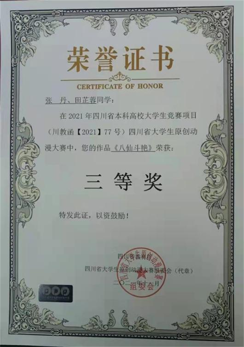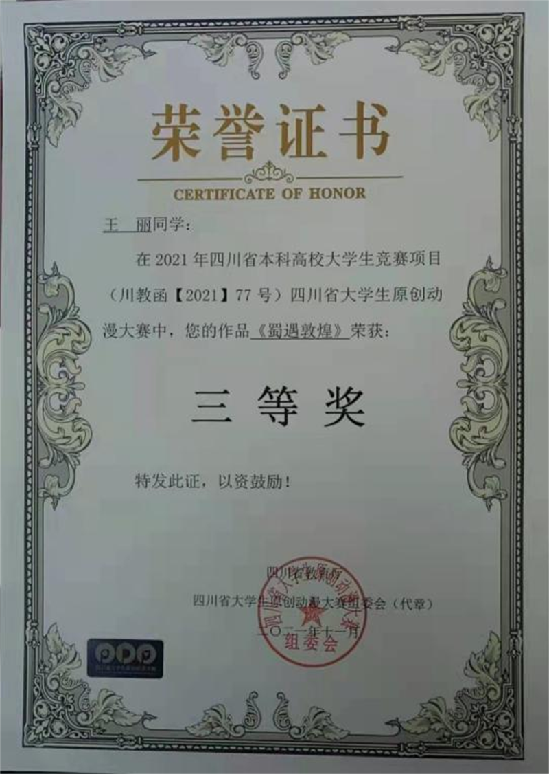 文创作品参加四川省教育厅主办的四川省原创动漫大赛获得二等奖1项,三等奖2项。