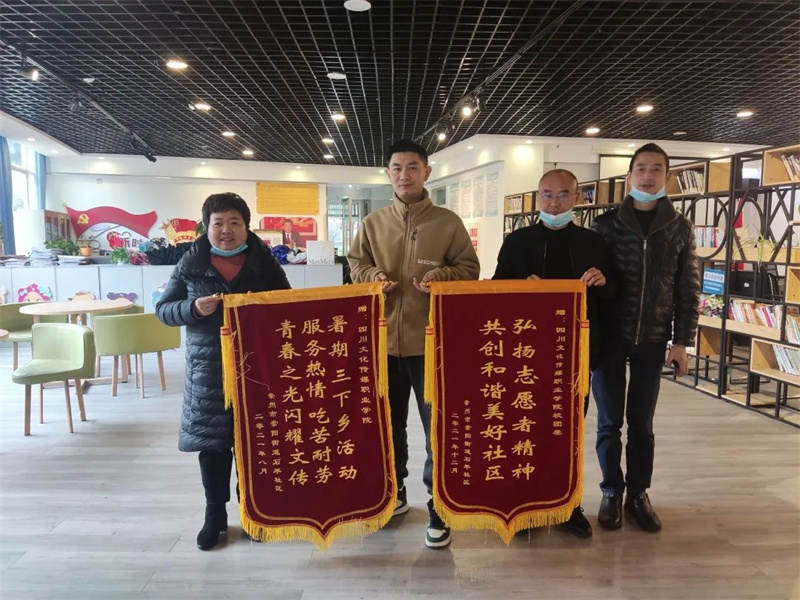 近日,崇州市崇阳街道石羊社区社区书记倪根华、副书记蒙强、纪委书记袁仕虎来我校进行志愿服务工作交流,并向我校赠送了“暑假三下乡活动,服务热情,吃苦耐劳,青春之光,闪耀文传”的三下乡活动锦旗和“弘扬志愿者精神,共创和谐美好社区”的敬老爱老活动锦旗。