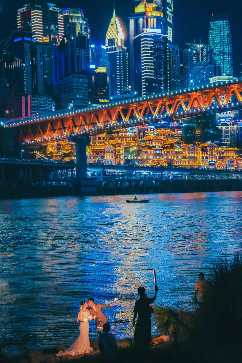 王善忠教授点评:华灯璀璨,流光溢彩。夜色中,把灯火通明的城市和幸福的一对恋人纳入镜头同框,将民族的繁荣昌盛与人们幸福生活的指数相结合。其色调以蓝色为主,将城市夜晚的色彩斑斓及万家灯火与新人婚纱照的幸福时刻相呼应,较好地结合了本次摄影大赛的主题展示。若能将右侧的空间在扩展,拓展一些,让新人处在黄金线上,构图会更加的完整。