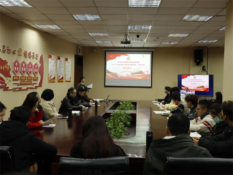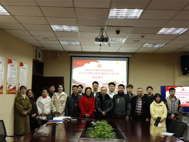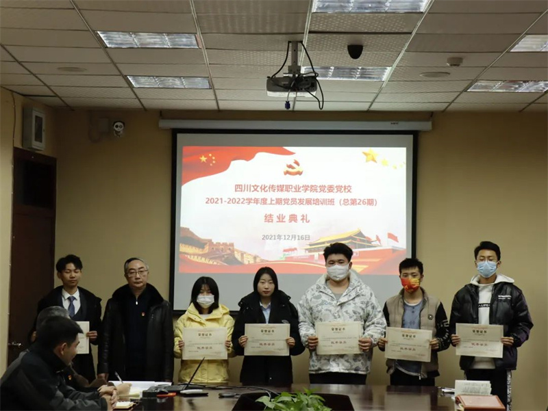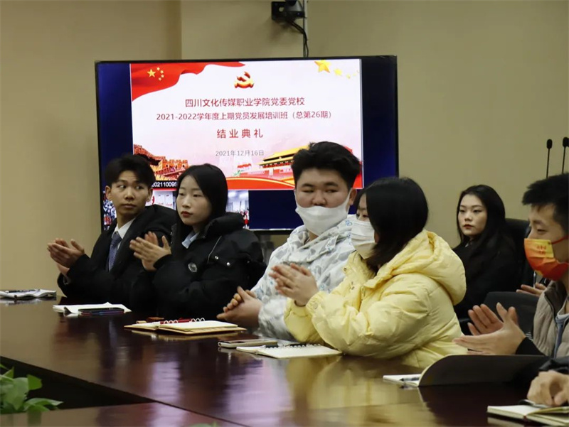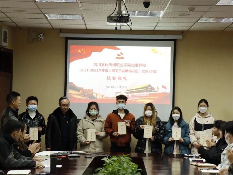 2021年12月16日下午,四川文化传媒职业学院党委党校在崇州校区四楼会议室隆重举行2021-2022学年度上期党员发展培训班(总第26期)结业典礼,绵竹校区通过视频连线参会。学院党委书记、党校校长周世伟,学院党委副书记、纪委书记、党校副校长杨云,学院党委委员、团委书记、党校常务副校长王林,及各基层党组织书记、委员,第26期党员发展培训班学员代表300余人参加典礼。典礼由党校办公室余姚主持。