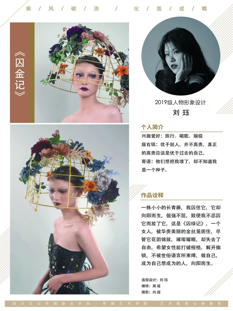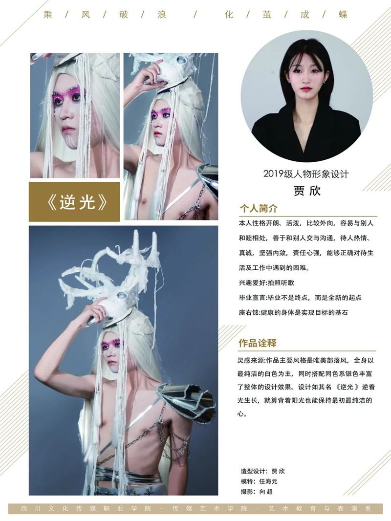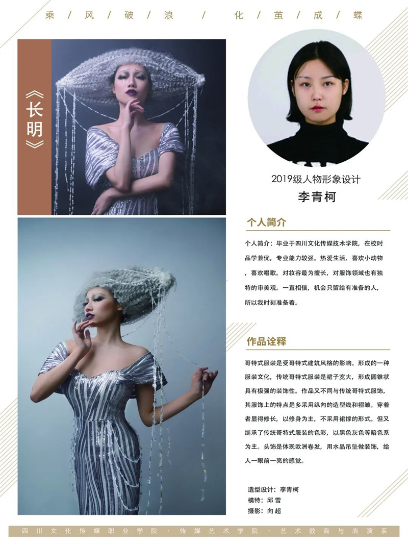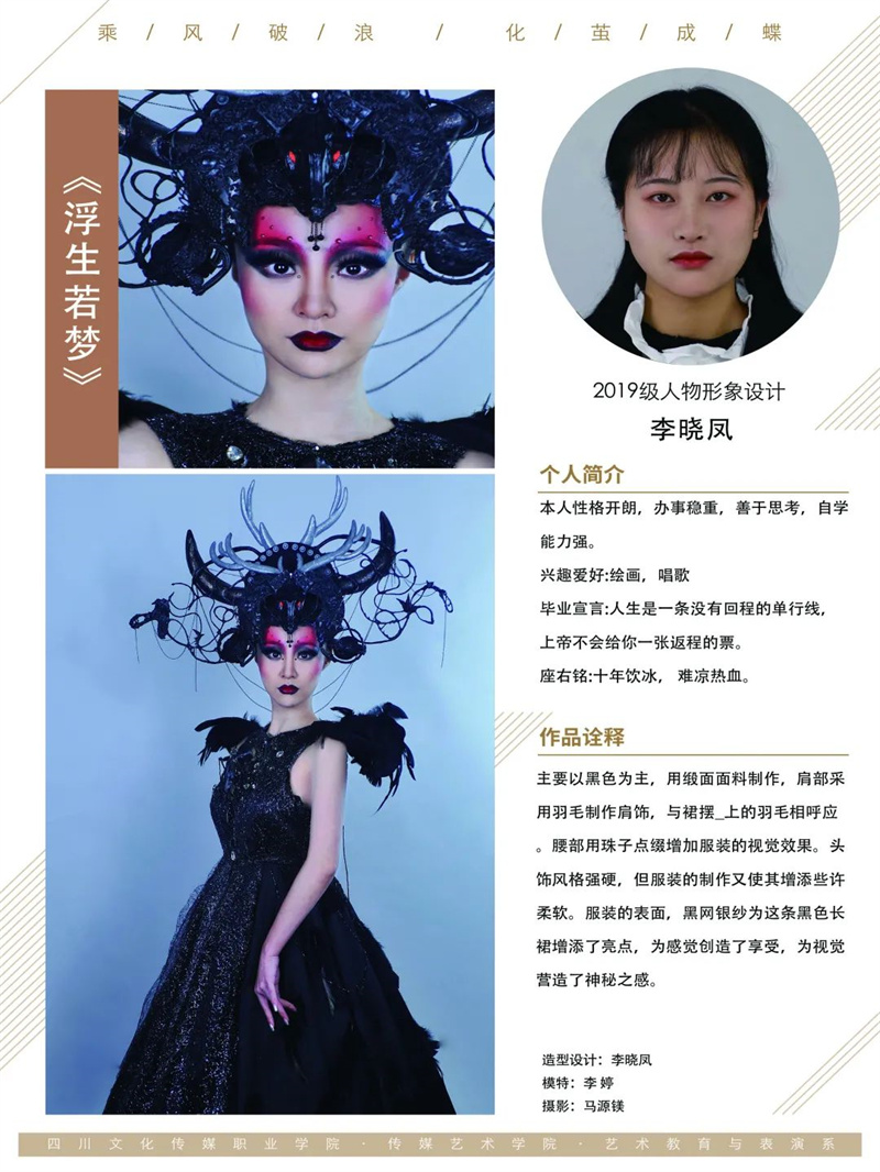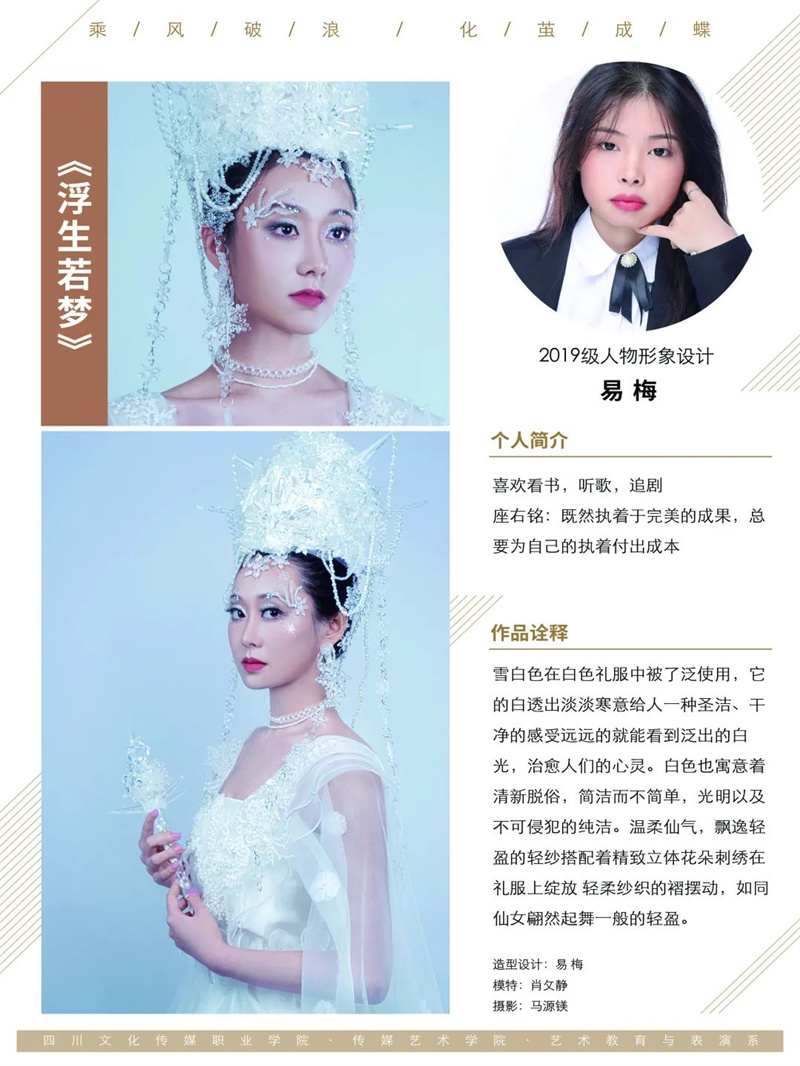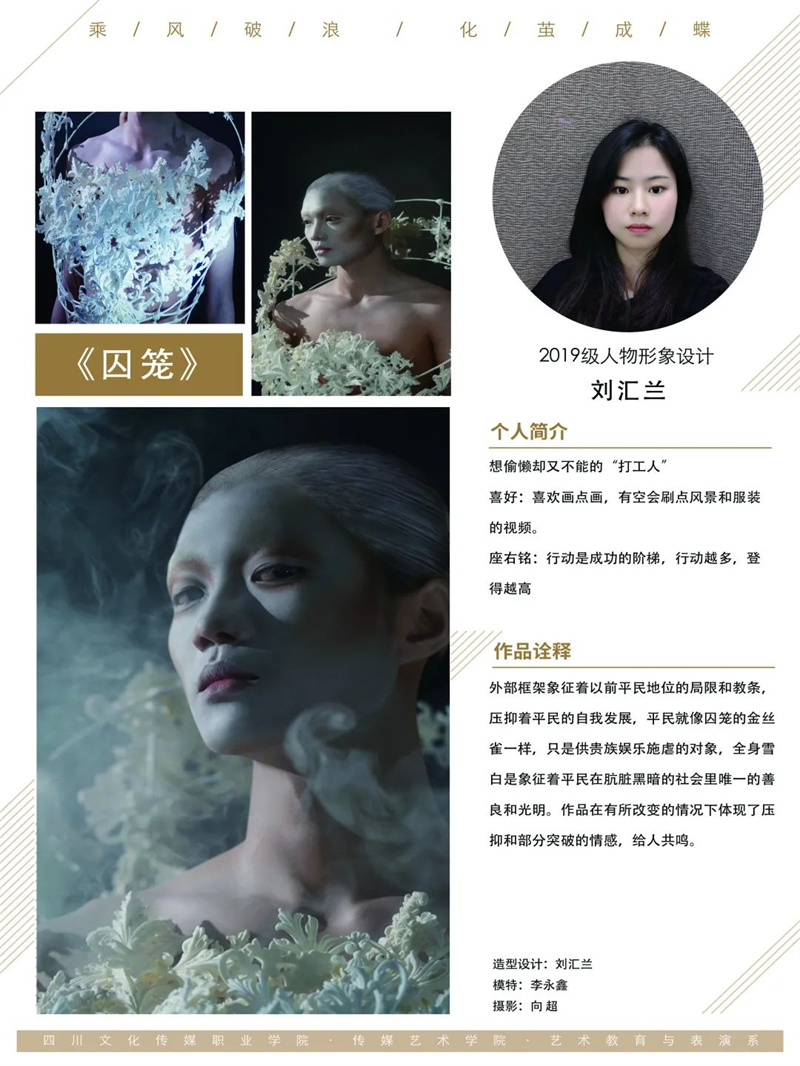 近日,四川文化传媒职业学院人物形象设计专业举办了沉浸式静展与服装灯光走秀毕业系列展,本次毕业展的主题由“化茧成蝶”、“乘风破浪”两个部分组成。