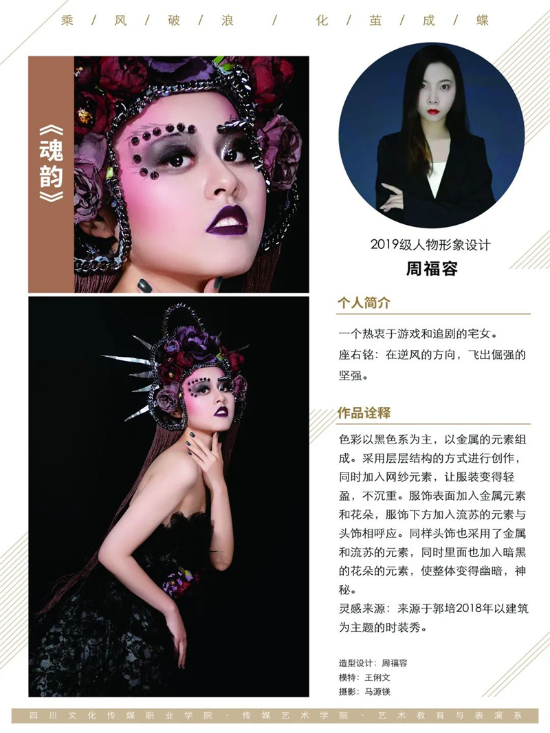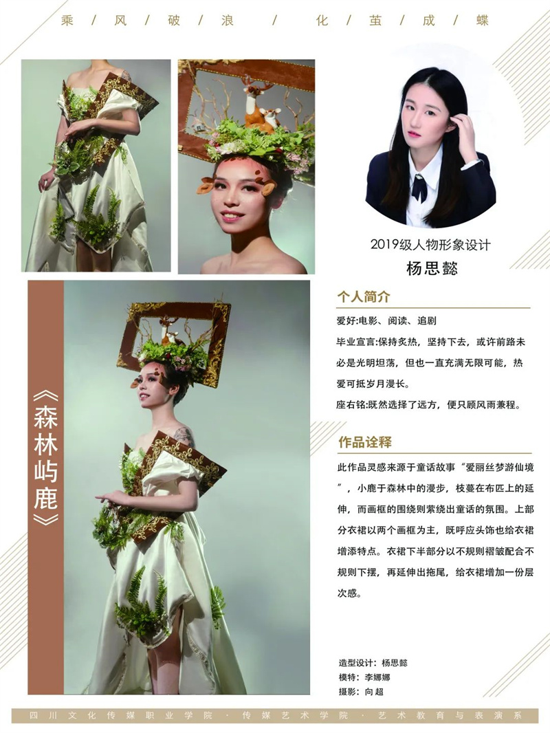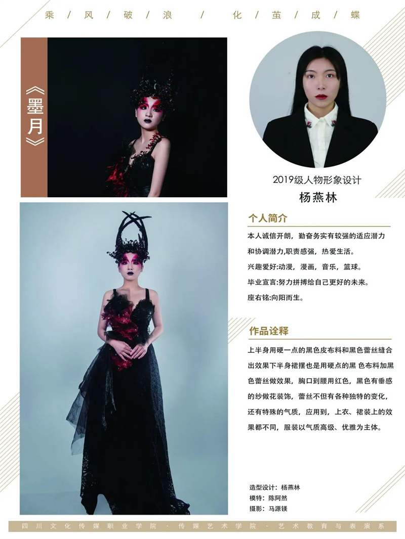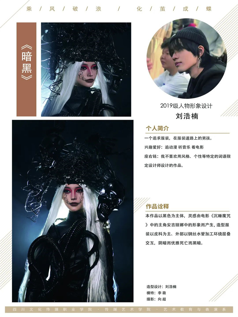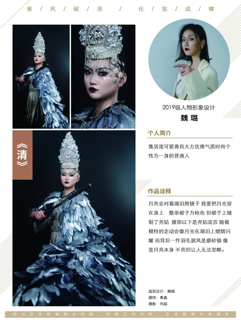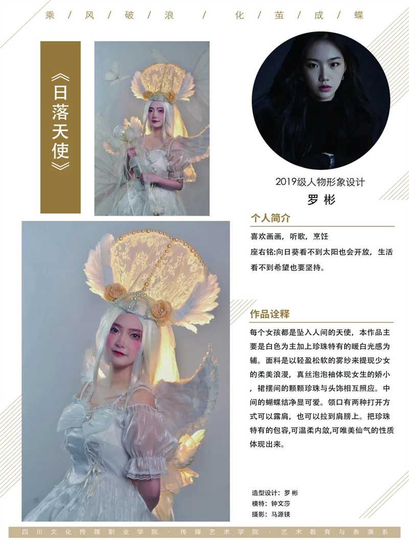 近日,四川文化传媒职业学院人物形象设计专业举办了沉浸式静展与服装灯光走秀毕业系列展,本次毕业展的主题由“化茧成蝶”、“乘风破浪”两个部分组成。
