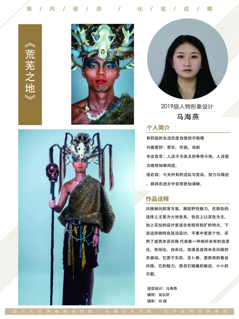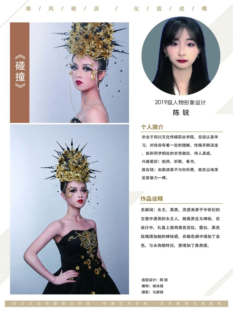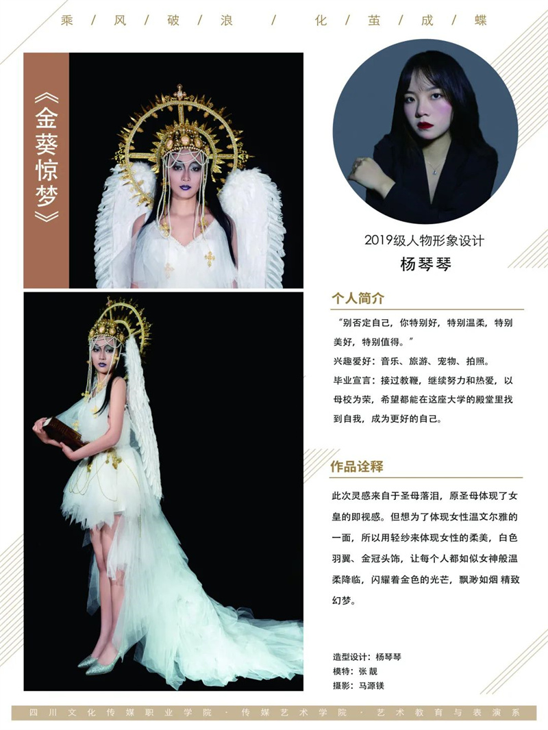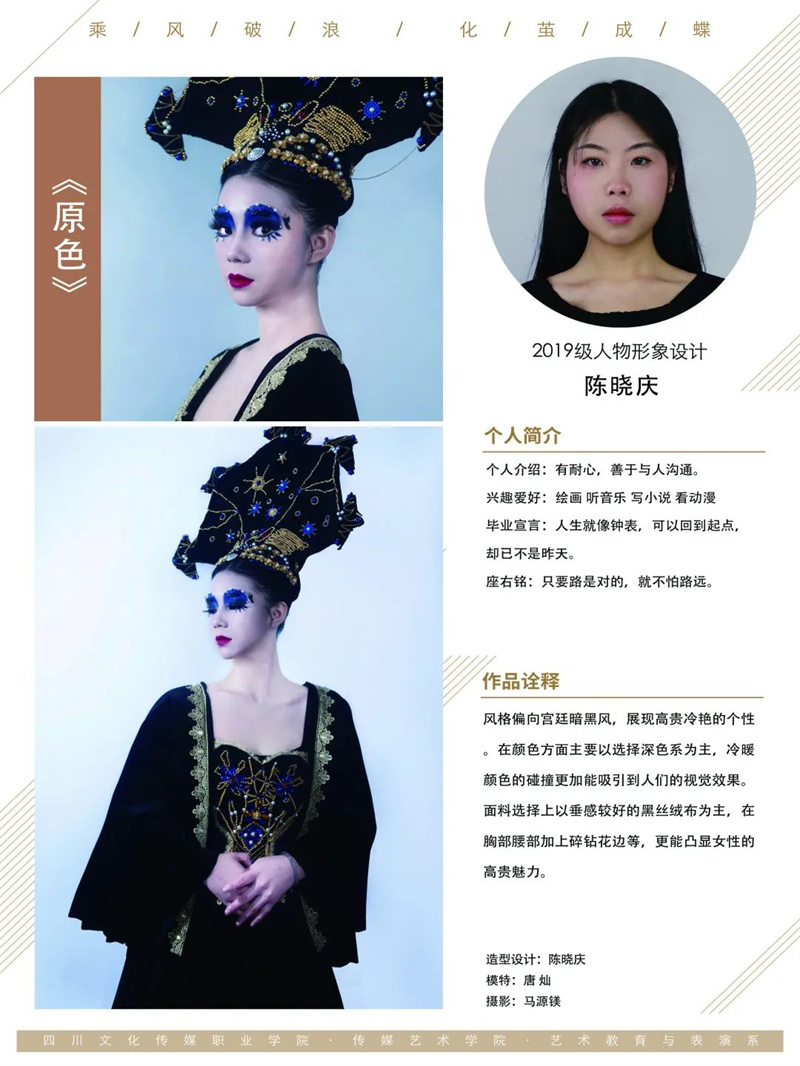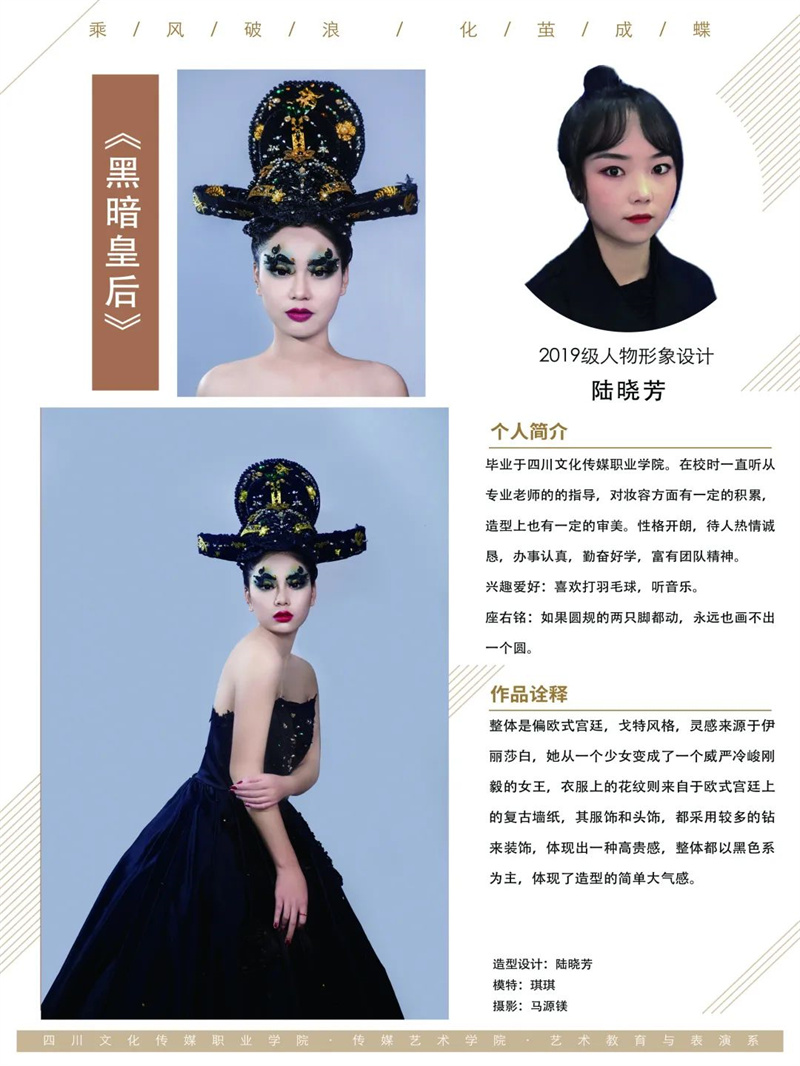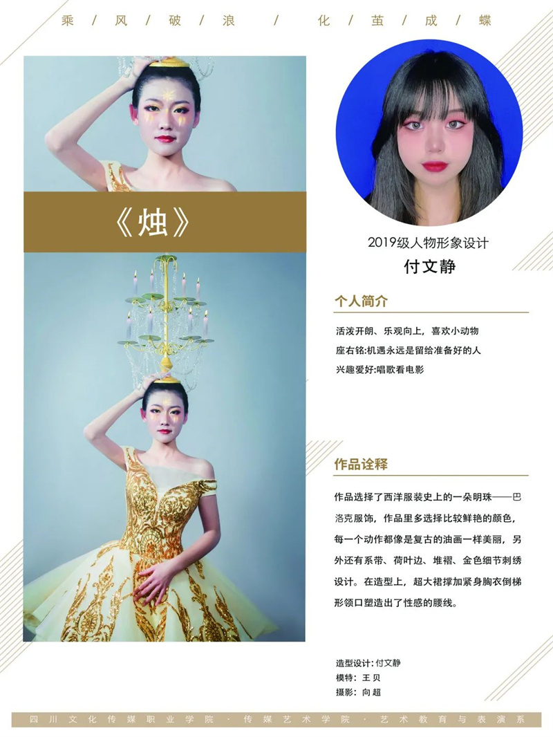 近日,四川文化传媒职业学院人物形象设计专业举办了沉浸式静展与服装灯光走秀毕业系列展,本次毕业展的主题由“化茧成蝶”、“乘风破浪”两个部分组成。