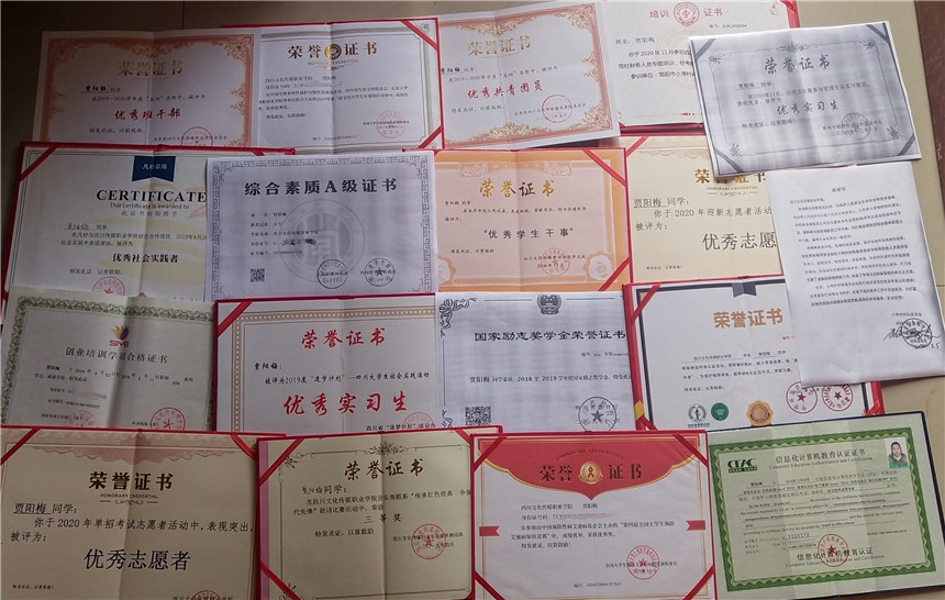 大学期间,她曾获得国家奖学金、国家励志奖学金、大学生综合素质A级证书、四川大学生社会实践活动“优秀实习生”、2020年第四届全国大学生预防艾滋病竞赛“优秀奖”、2019年第三届全国大学生环保知识竞赛“优秀奖”、2020年全国大学生组织能力大赛“优秀奖”、优秀班干部、优秀共青团员、优秀学生干事、优秀志愿者等荣誉,看着自己厚厚一摞奖状证书,贾杨梅没有骄傲自满,反而觉得自己要更加坚定、更加努力。