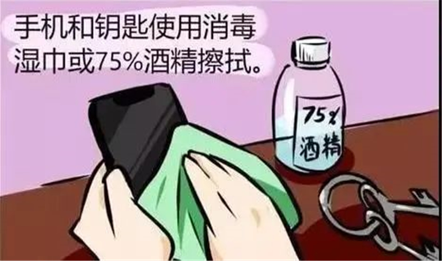2、把外套、包等消毒后放置在固定房间的角落,尤其要给手机、钥匙等进行消毒。