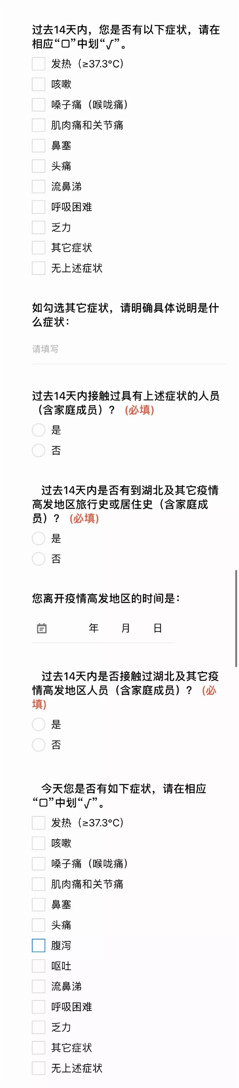 此健康情况申报卡除了姓名等基本信息以外,还包括: