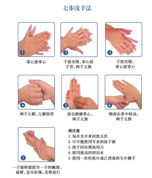 (1)手部皮肤清洁:注意修剪指甲,不戴戒指等饰品,减少接触公共物品和设施,随时保持手卫生;需要用肥皂或洗手液洗手,按“七步洗手法”清洗。