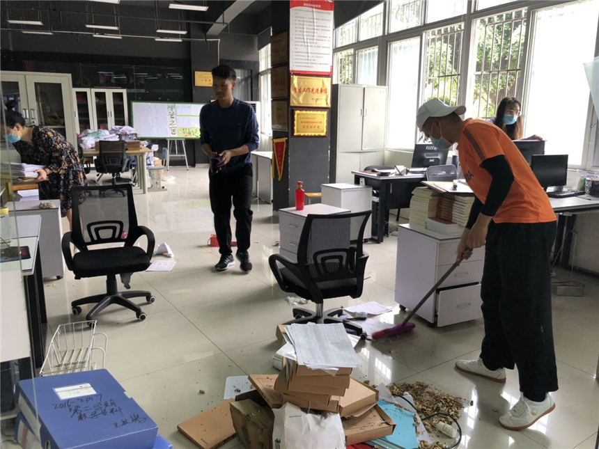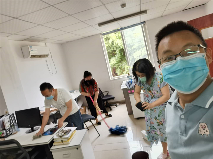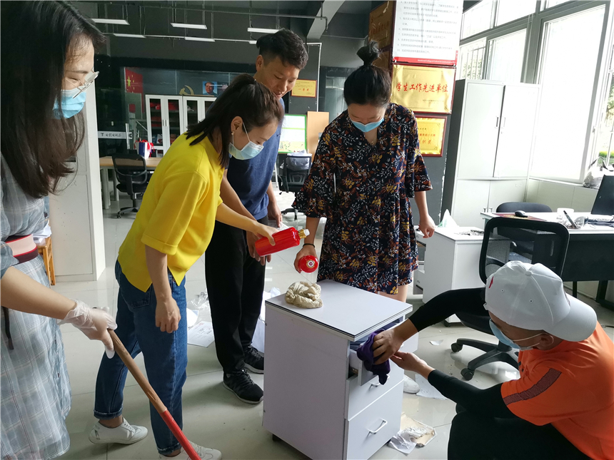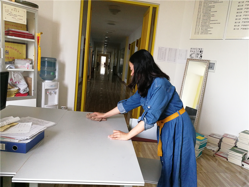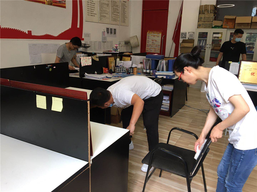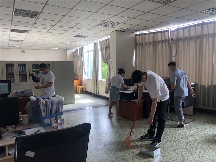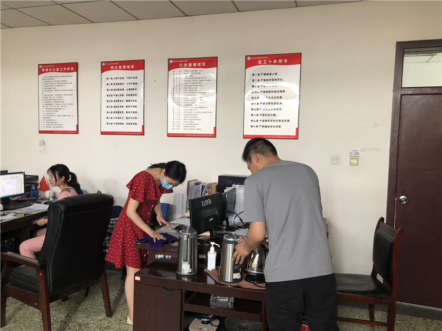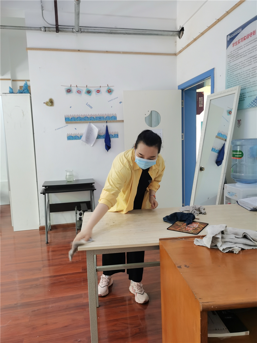 各系部教职员工对办公区域进行通风换气,打扫办公场所卫生,对办公室内的桌椅、物品消毒擦拭,营造良好的公共卫生环境。