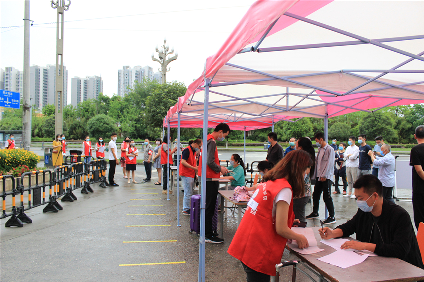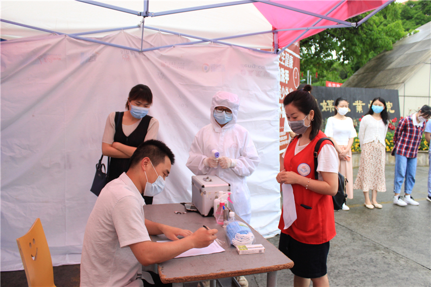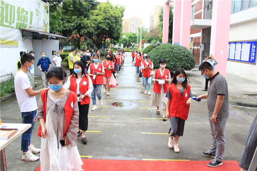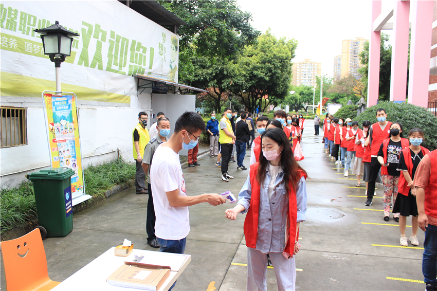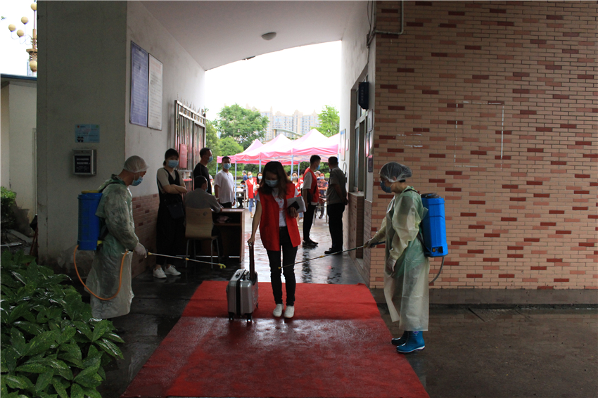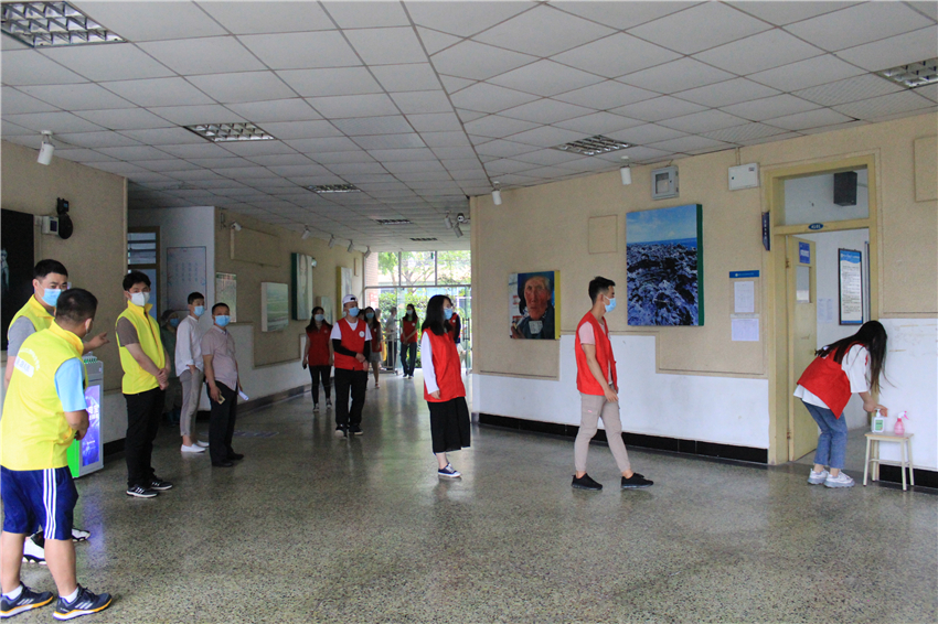 在学生返校报到场景演练中,由50名教职员工扮演学生,学院设有入校通道、体温监测处、行李消杀点、身份核验点和临时滞留点等,学生入校时需按照要求排队,且每人前后左右间隔为1.5米 。