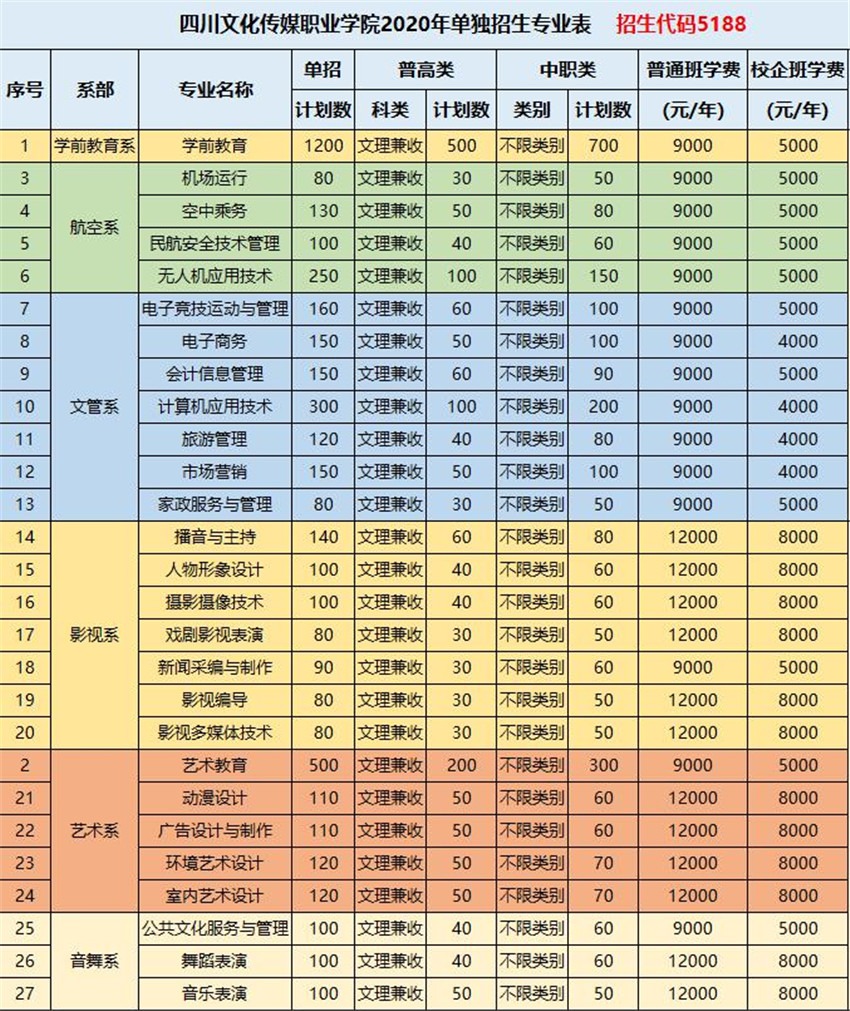 附:四川文化传媒职业学院2020单招专业表