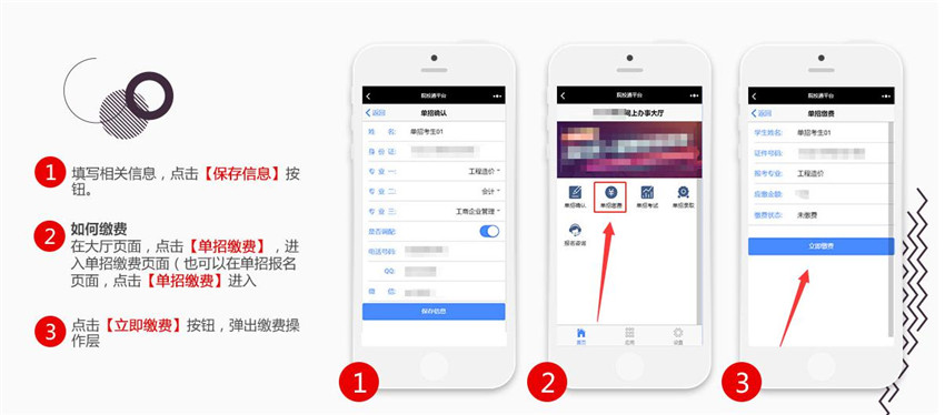 五、完成专业确认后点击保存按钮,返回大厅点击单招缴费。