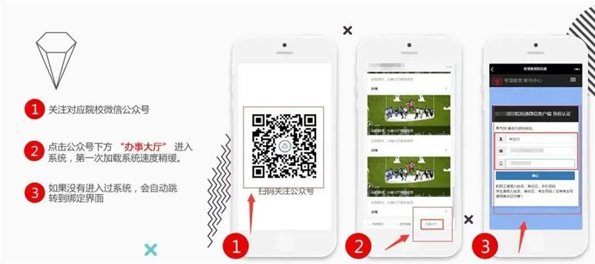 三、扫码关注“传媒学院服务平台微信公众号”→点击公众号下方“办事大厅”→进入绑定页面。