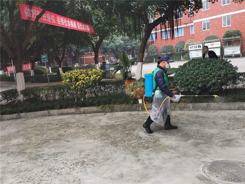 自疫情防控工作开始,学院对崇州、绵竹两个校区都采取封闭式管理,后勤处、安保处迅速反应,根据学院防控工作的要求,多方筹备,做好防控物资储备和调配;密切监控,加强留校人员的体温检测;全面出击,做好校园清洁和消毒预防工作;加强沟通,时刻保持信息交流和工作联动;全面投身疫情防控各项工作,安排全体人员在校值班。制定保障疫情防控应急预案、食堂就餐预案等;对防控物资的准备和安全消毒杀菌等工作进行安排部署。每日督促两个校区的后勤人员对教学楼、行政楼、图书馆、宿舍、垃圾桶等进行全面消毒,清理卫生死角,确保校园干净、卫生,将防疫防控各项工作落到实处。