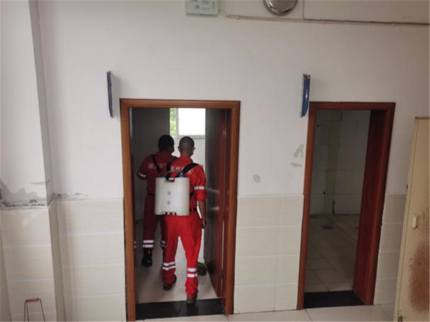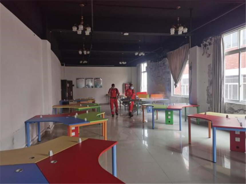 在学院后勤工作人员与物业工作人员的配合下,蓝盾救援中心一行人员进入校园后,立即着手各项准备工作。在消杀作业现场,蓝盾救援中心人员携带专业消杀设备,制定消杀计划,身穿防护服,手持弥雾机,分组开展消杀工作。消杀范围覆盖教学楼、食堂、宿舍、操场、办公室、洗手间,校园周边环境等。同时,对师生需要使用的、可能触碰的区域和物品逐一实施消毒杀菌,对门卫室、饮用水房、楼道、楼梯扶手、洗手池、垃圾桶等重点区域实施密集反复消毒,通过地毯式消杀,不留死角。