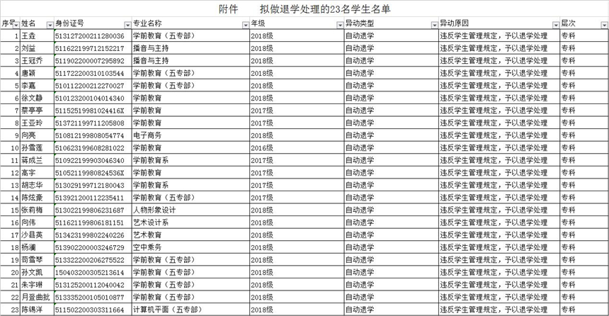 根据教育部颁发《普通高等学校学生管理规定》(41号令))第三章第三十条第四项规定,以及《四川文化传媒职业学院学生学籍管理办法》第九章第五十条第四项规定——未经请假连续离校两周未参加学校规定的教学活动者,应予以退学的规定。经教务处和学生处核查,现有王垚等23名学生违反以上规定,拟对该23名学生进行退学处理。