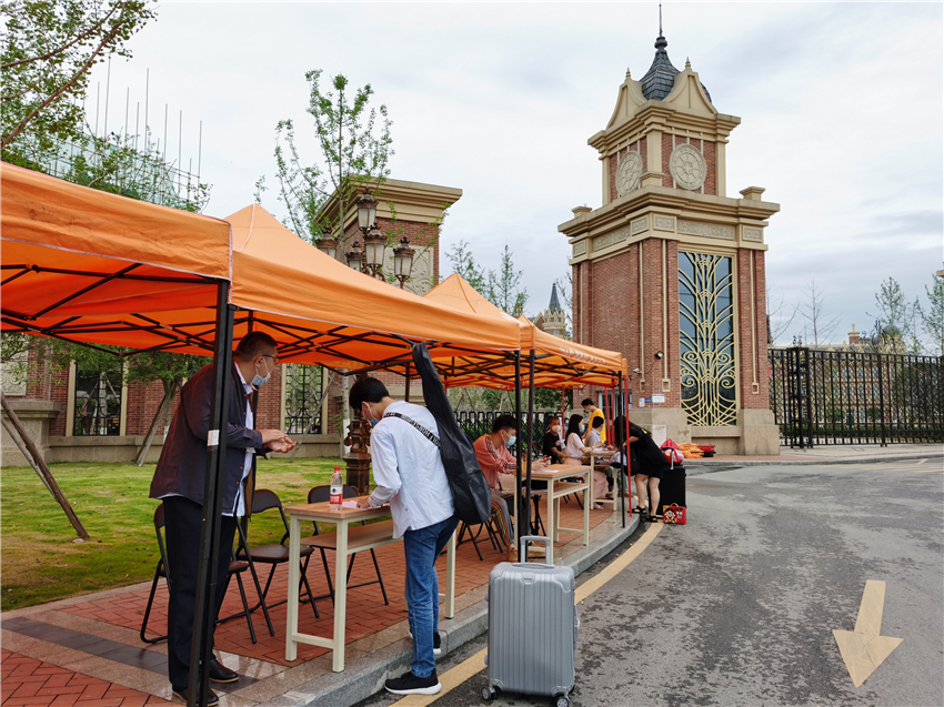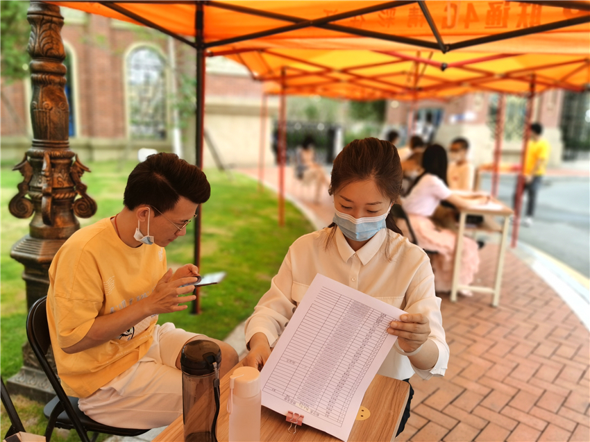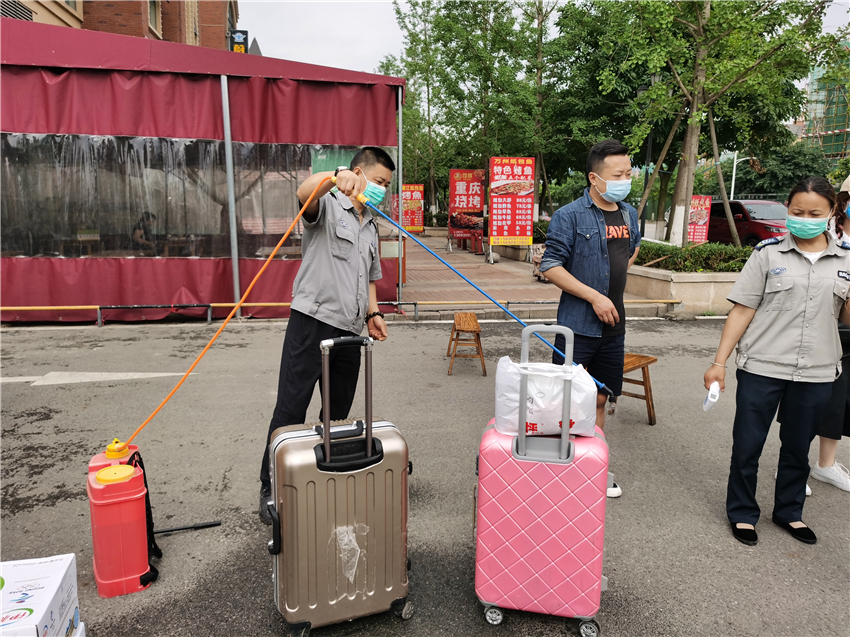 学院大门设置有消毒通道、体温监测处、资料审核处,进校前,返校的文传学子需按规定有序排队,并配合保安人员进行行李消毒及体温检测工作,出示身份信息及两码并填写承诺书方可进校。现场有条不紊、秩序井然,为学生安全返校筑起了第一道防线。