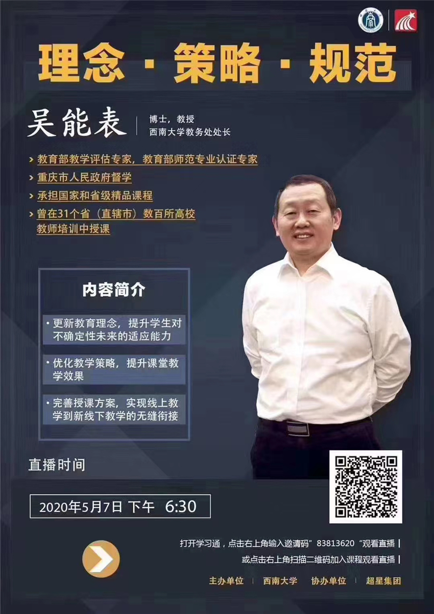 5月7日下午,西南大学教务处处长吴能表教授就第一堂课:“理念·策略·规范”进行直播培训。