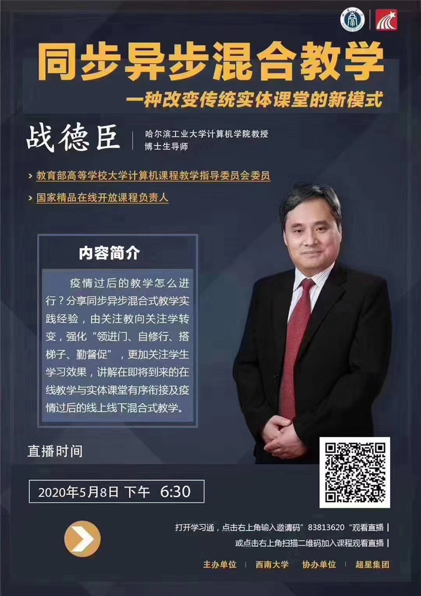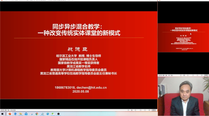5月8日下午,哈尔滨工业大学战德臣教授就第二堂课:“同步异步混合教学---一种改变传统实体课堂的新模式”进行直播培训。