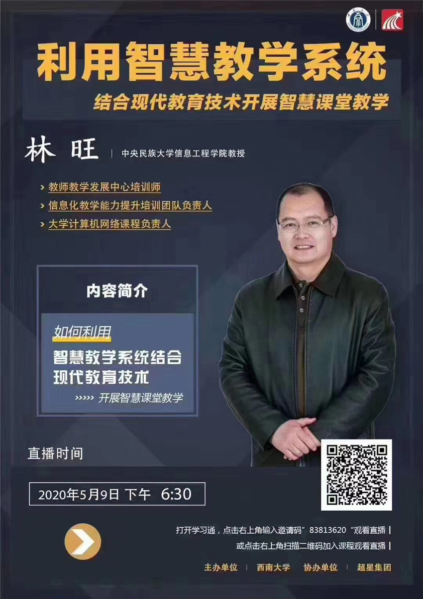 5月9日下午,中央民族大学林旺教授就第三堂课:“利用智慧教学系统结合现代教育技术开展智慧课堂教学”进行直播培训。