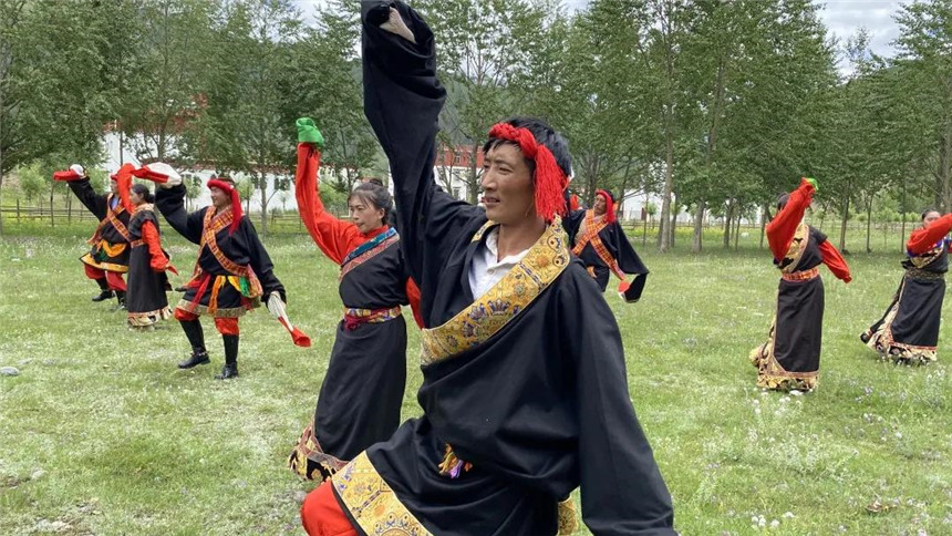7月7日下午,四川文化传媒职业学院罗江副院长一行在真达乡党委书记白玛扎西热的带领下来到了真达乡草原,与真达乡的藏族同胞们一同跳起锅庄,拍摄团队全程记录。舞者身着藏袍、脚蹬皮靴、脚系铜铃,善舞者与伴舞者或各列一队、或混列成圈,时而蹬跳转走、时而抒袖高歌。真达锅庄舞蹈动作以彪悍雄健、舒展奔放、活泼开朗为特色,兼容农区锅庄和牧区锅庄之所长,风格在甘孜州锅庄舞中独树一帜。从一千多年前吐蕃王朝的祭祀活动,演变成庆祝丰收、举办庆典和宗教法会的表演,再到成为真达乡的非遗文化,锅庄舞蹈历经沧桑,昂扬精神在藏族同胞身上流传。同时,扶贫工作组共收录四首锅庄传承人唱奏的锅庄音乐,石渠锅庄分高调式和宫调式,旋律悠扬飘逸、歌词质朴传情,歌颂石渠山河、祈祷人民幸福,具有鲜明的民族特色。