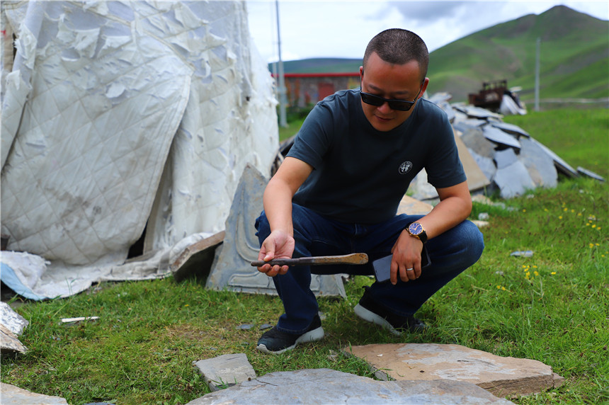 7月8日上午,在学院驻村干部韩嫣老师的陪同下,扶贫调研工作组驱车前往石渠县长须贡马乡。长须贡马乡党委副书记土登尺里热情接待了罗江副院长一行,之后一同前去参观巴格嘛呢石刻产业专业合作社,对巴格嘛呢石经墙进行拍摄。巴格嘛呢墙全长1.6公里,墙体全部由嘛呢石片垒成,石片上刻着六字箴言和《甘珠尔》、《丹珠尔》的部分经文。墙头上五色经幡飘扬、墙体两边的窗口里摆放、雕刻者精美传神的佛像,嘛呢墙与长长的转经筒墙、八宝白塔、经幡塔群相呼应,整座建筑群就像扎溪卡草原上的一条巨龙。佛教信徒们和众多相爱的青年男女都会垒上祈愿的嘛呢经石,久之成墙,数百年来屹立在太阳部落人民的心中。