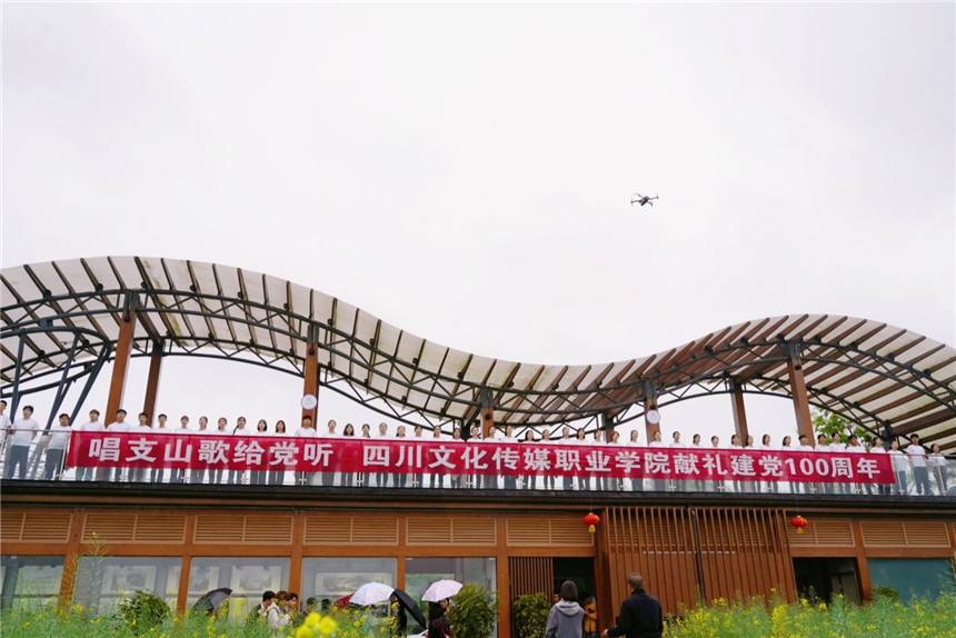 这是由四川文化传媒职业学院党委、四川文化传媒职业学院传媒艺术学院党总支、崇州市五星村村委会共同举办的“献礼建党100周年,唱支山歌给党听”主题活动。此次活动经过多次实地勘察,最终选择了五个展现乡村风貌的代表场景,通过分场景表演、全过程拍摄,用镜头记录参演领导、师生饱满昂扬的精神面貌,也记录乡村振兴战略下五星村的发展风采,后期将会制作成快闪活动专题记录片。