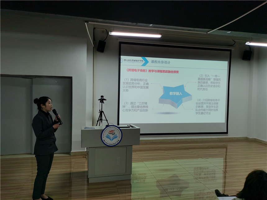 张倩副院长在点评电子商务专业教师谢舒雯的《跨境电子商务》说课时肯定了说课教师在课程建设和改革过程中的深入思考;在点评过程中,张院长深入浅出地对与会的所有任课教师做了如何把握说课重难点的培训,张院长讲到说课重在课程定位和目标,难在课程内容和教学设计,要系统地分析教材和学生,要清晰阐述自己的教学思考及理论依据,说课要服从于教学目标,不能和教学内容脱节,还要具体、明确而全面。