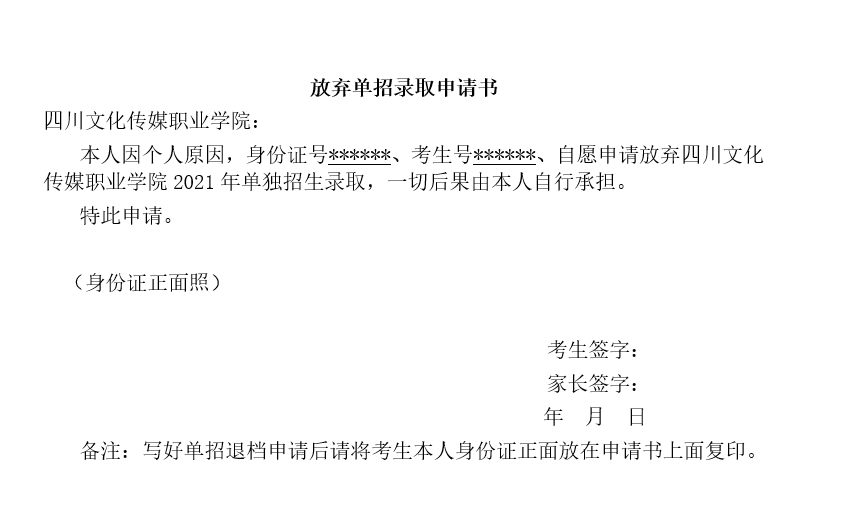 3、如有放弃单独招生录取资格的考生,请于2021年4月11日前,需考生提供本人签字的放弃录取申请书和身份证复印件,到校学院招生处办理退档手续,逾期不再接受放弃录取申请。