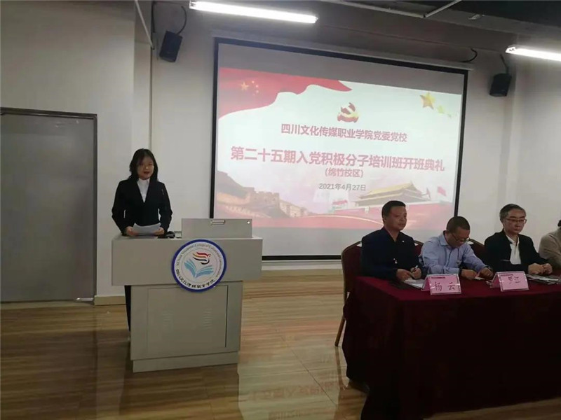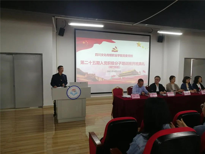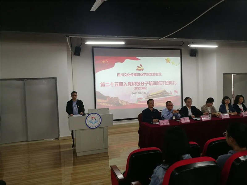 2021年4月27日,四川文化传媒职业学院党委党校第二十五期入党积极分子培训班开班典礼在绵竹校区九教学术报告厅隆重举行。学院党委书记、省政府督导专员周世伟,党委副书记、纪委书记、执行院长罗琴,党委委员、副院长罗江参加开班典礼。典礼由学院院长助理兼党政办主任、机关第二党总支书记杨云主持。