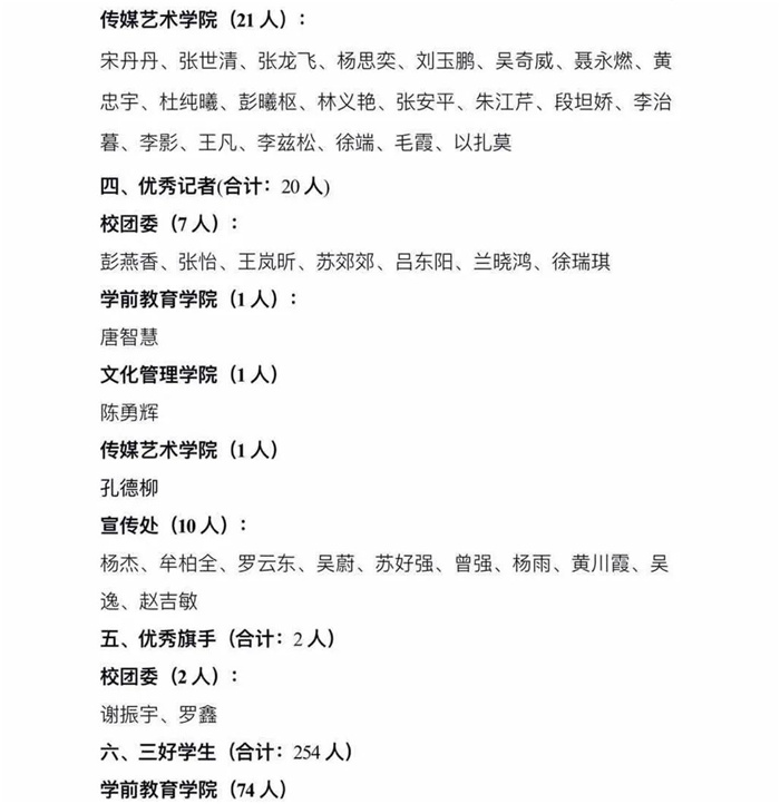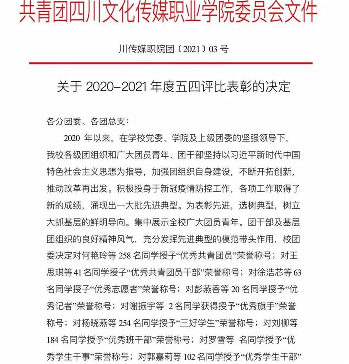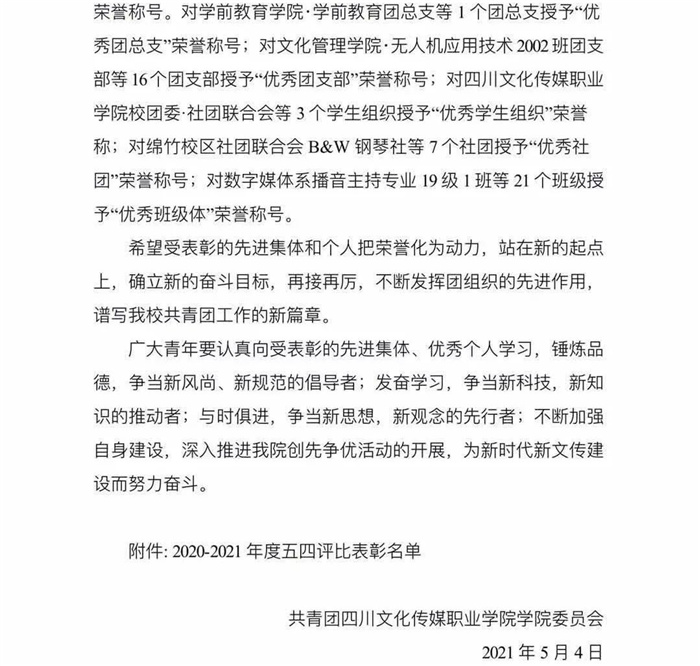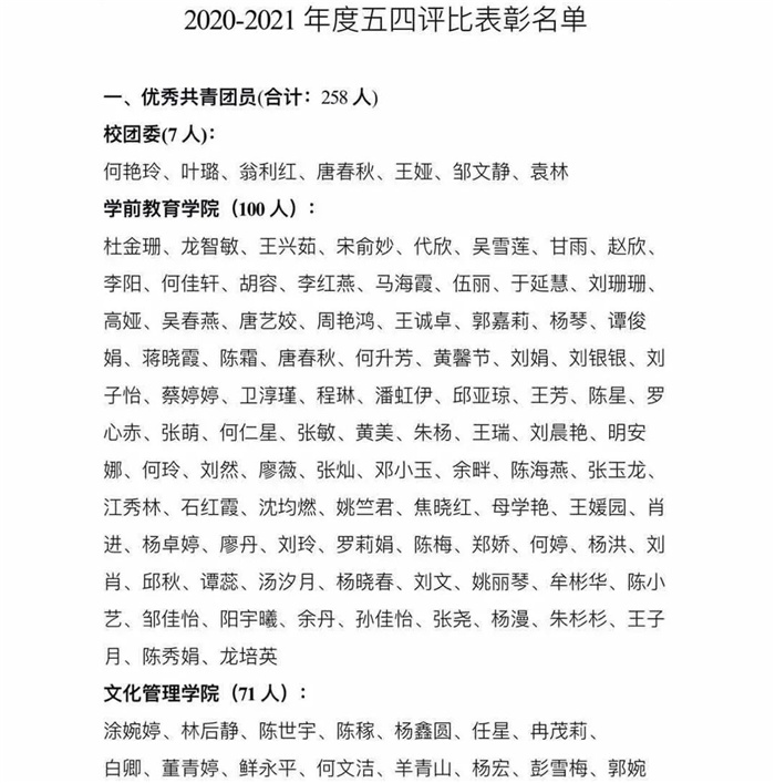 在各个团总支推荐申报的基础上,通过支撑材料审核、现场学生答辩、评委提问等环节,最后经校团委工作小组审核,现将2020—2021年度“五四评优”集体、个人评选结果公示如下: