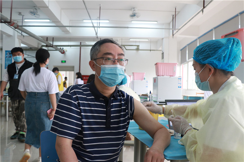 在接种工作进行中,学院党委书记周世伟、执行院长罗琴与学院领导班子在接种现场进行指挥并带头接种,广大师生积极主动加入到共筑免疫屏障的队伍当中,与全国人民一起为彻底战胜新冠疫情贡献力量!