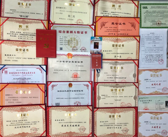 就这样侯雪婷凭借着自己持续不断的努力,大学三年来先后获得了国家奖学金、国家励志奖学金、优秀记者、优秀班干部、三好学生、最佳美术编辑、精准扶贫先进个人、奋斗之星、2021届四川省优秀大学毕业生等荣誉称号。当一份份荣誉捧在手中时,很多人说她运气好,但侯雪婷认为,从来没有无缘无故的奖励,幸运永远和努力成正比。