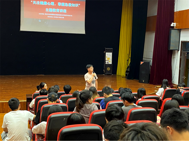 为构建和谐社会,打造平安校园,关注心理健康,提升师生的应急救护意识,2021年6月3日晚,由艺术设计系党支部开展的“关注心理健康,掌握急救知识”主题教育讲座在小剧场举行,艺术设计系部分教师代表、艺术设计系学生和入党积极分子参加活动。本次讲座邀请了崇州市红十字会救护培训注册师资陈攀老师以及心理学专业靳水宁老师为大家讲授急救知识与应急处理、心理危机与预防干预等相关内容,传媒艺术学院党总支书记何柳、艺术设计系党支部书记李娟、艺术设计系主任陆奕兆参加主题教育讲座。