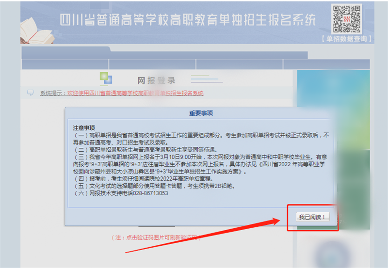 点击【我已阅读】,再根据提示填写考生号、身份证号、登陆密码和验证码,点击【登陆】-【报名信息】。