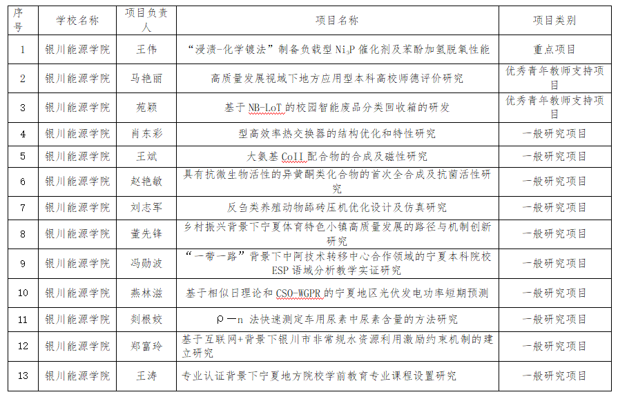 近日,自治区教育厅公布的2022年高等学校科学研究项目立项名单中,银川能源学院有13个项目获批立项。其中重点项目1项,优秀青年教师支持项目2项,一般研究项目10项。