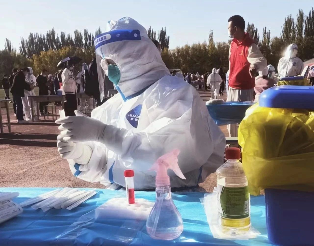 11月28日深夜,在美食广场一楼大厅内的核酸筛查采样现场,一位中等身材,步伐沉稳的男子映入眼帘。他熟练地穿上防护服,将采样用品整齐地放在面前,面罩外只能看清他疲惫的双眼,他就是侯国安老师,来自化学与生物工程学院,在校15年,现在是名副教授。