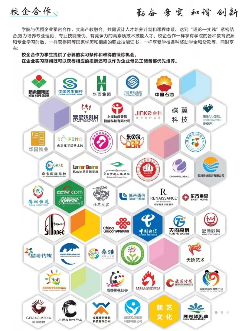 学校始终坚持就业优先战略、落实就业优先政策,每年新增校企合作单位超200余家,每年为毕业生提供岗位超3万余个。与德阳天府数谷产业园、万达集团、上海虹桥机场、北京首开集团、华强方特集团等知名企业建立了深度的合作关系,在成渝经济区、北上广深等中心城区设有实习实训基地260余个。近三年我校毕业生去向落实率均在省平线以上,涵盖事业单位、国有企业,民营企业,外资企业等各类优质企业。
