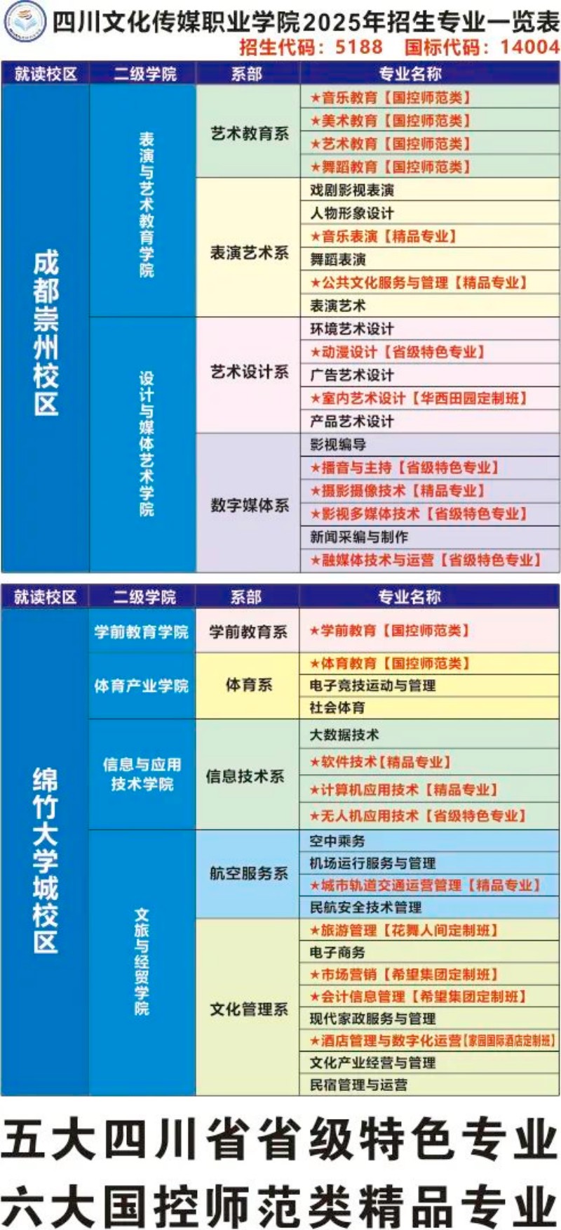 学校着力培养面向区域、行业发展和在文化产业生产服务、经营和管理一线需要的上手快、留得住、干得好、后劲足,具有良好的职业精神的文化传媒技术技能型人才。现设有41个专业,根据四川省、成都市经济社会和文化产业发展规划,主动适应文化产业的发展和转型需求,逐步优化专业结构,坚持以“服务区域经济文化发展”为根本、以“文化服务和文化教育”为主体、以“媒体艺术与媒体技术”为支撑的 “12257”专业建设思路。着力构建广播影视、文化教育、艺术设计、表演艺术、航空服务五大特色专业群,重点打造影视多媒体技术、摄影摄像技术、学前教育、动漫设计、广告设计与制作、公共文化服务与管理、无人机应用技术七个核心专业。截至目前,我校拥有6个国控师范类专业。努力把学校建设成为文化艺术人才培养、创作生产、传承创新的高等职业教育重要基地,在省内同类院校中有较高知名度的高职院校。