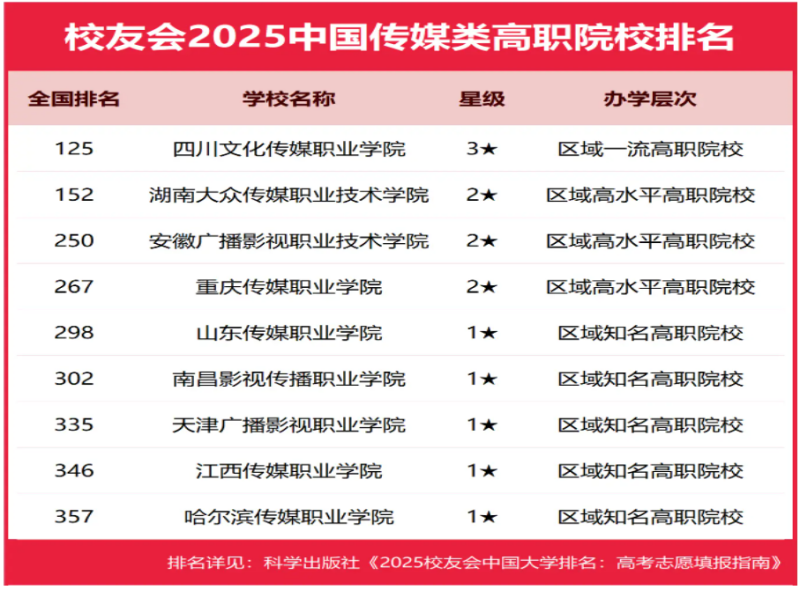 榜单显示,四川文化传媒职业学院在2025中国高职院校排名中,为全国125名,位2025中国传媒类高职院校第一!