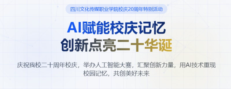 为庆祝四川文化传媒职业学院建校二十周年,探索人工智能在创意领域的应用,特举办“廿载育才,奋进新篇·首届人工智能AIGC创新大赛”。本次大赛旨在鼓励学生运用AIGC技术进行创作,展现创新思维与技术实力,为学校二十周年庆献礼。目前大赛报名已启动,一起来看赛事安排。