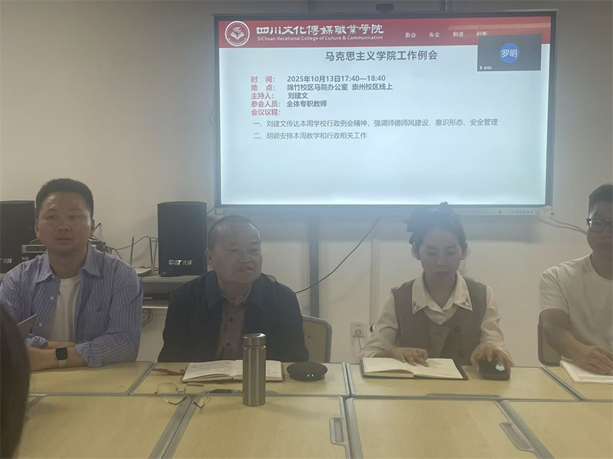 2025年10月13日17:40-18:40,马克思主义学院在绵竹校区4316组织部门例会,崇州校区线上参会,马院院长刘建文主持会议,会议内容如下: