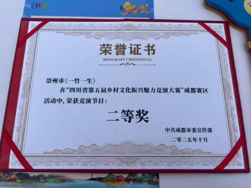 本次竞演采用 “在线初审 + 专业线下评审 + 网络热度比拼” 的多维评选机制,从成都市 17 个涉农区(市)县选送的 60 余个节目中层层筛选。《一竹一生》凭借深厚的文化内核、感染力十足的舞台呈现,以及对非遗技艺与文旅体验融合的创新探索,最终荣获二等奖,充分彰显了崇州乡村文化的独特魅力。