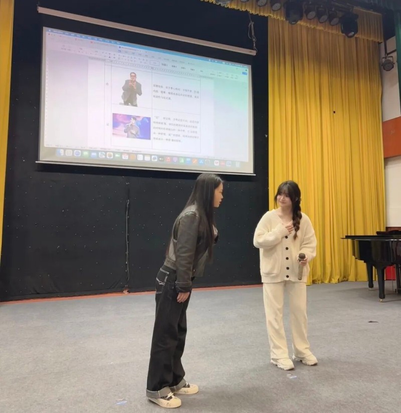 董老师以《同桌的你》为例,拆解情境中的配合要点,包括动作衔接、眼神交流、情绪同步等,帮助学生理解 “整体表演大于个体表现” 的团队协作逻辑。