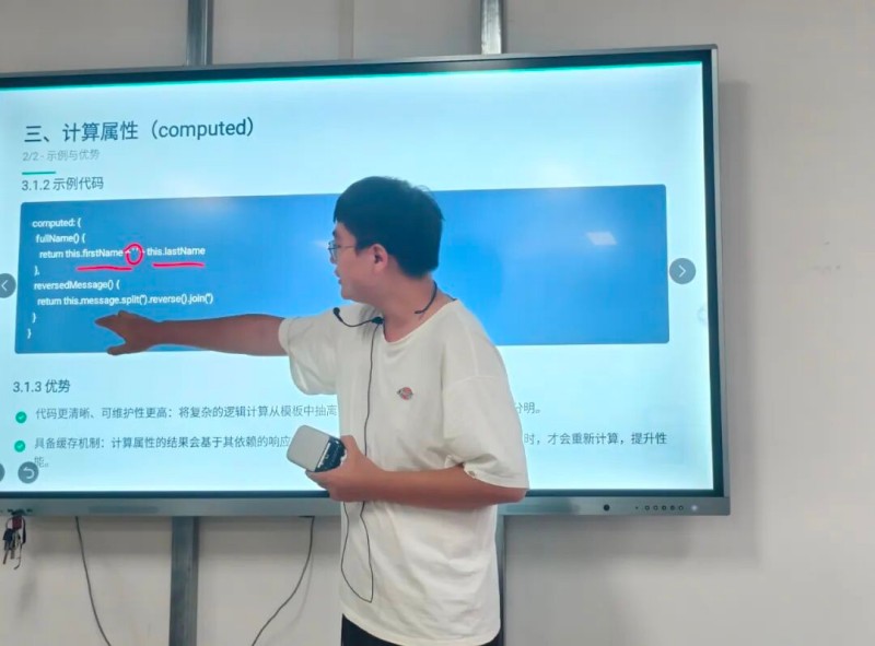 “大家看左屏的规范代码,再对比右屏这位同学的实操 ——computed 属性在这里是不是自动更新了购物车总价?” 在《Vue.js 》课堂上,朱焜老师的声音清晰有力,讲台前的双屏幕正同步呈现着 “响应式数据处理” 的核心知识点。