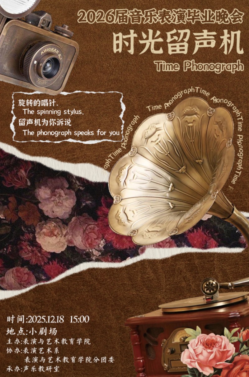 音乐表演专业举行“时光留声机”——2026届毕业晚会。学子们以三年专业积淀为笔,以跨越时代的经典金曲为墨,为青春书写最动人的注脚,为时光留下最真挚的回响。